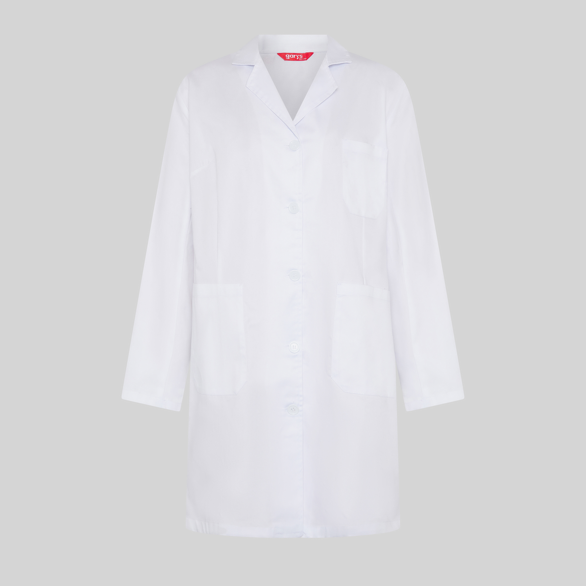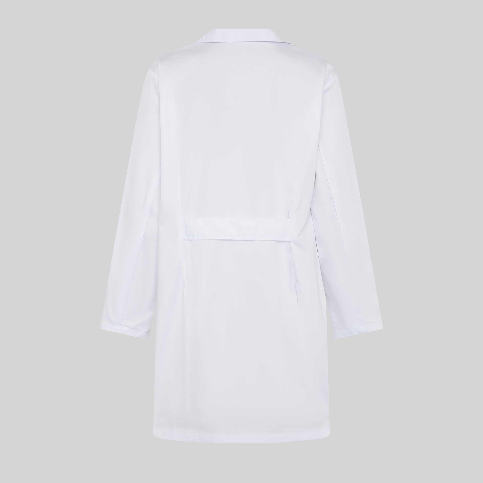 Bata básica de mujer, manga larga, con cierre de botones, cuello con solapa y cinturón trasero. Semi ajustada con pinzas delanteras y traseras. Incluye un bolsillo en el pecho y dos bolsillos de parche en la cintura. Confeccionada en sarga blanca, ideal para hospital, clínica, laboratorio, farmacia y demás profesionales sanitarios. Modelo RED LINE.