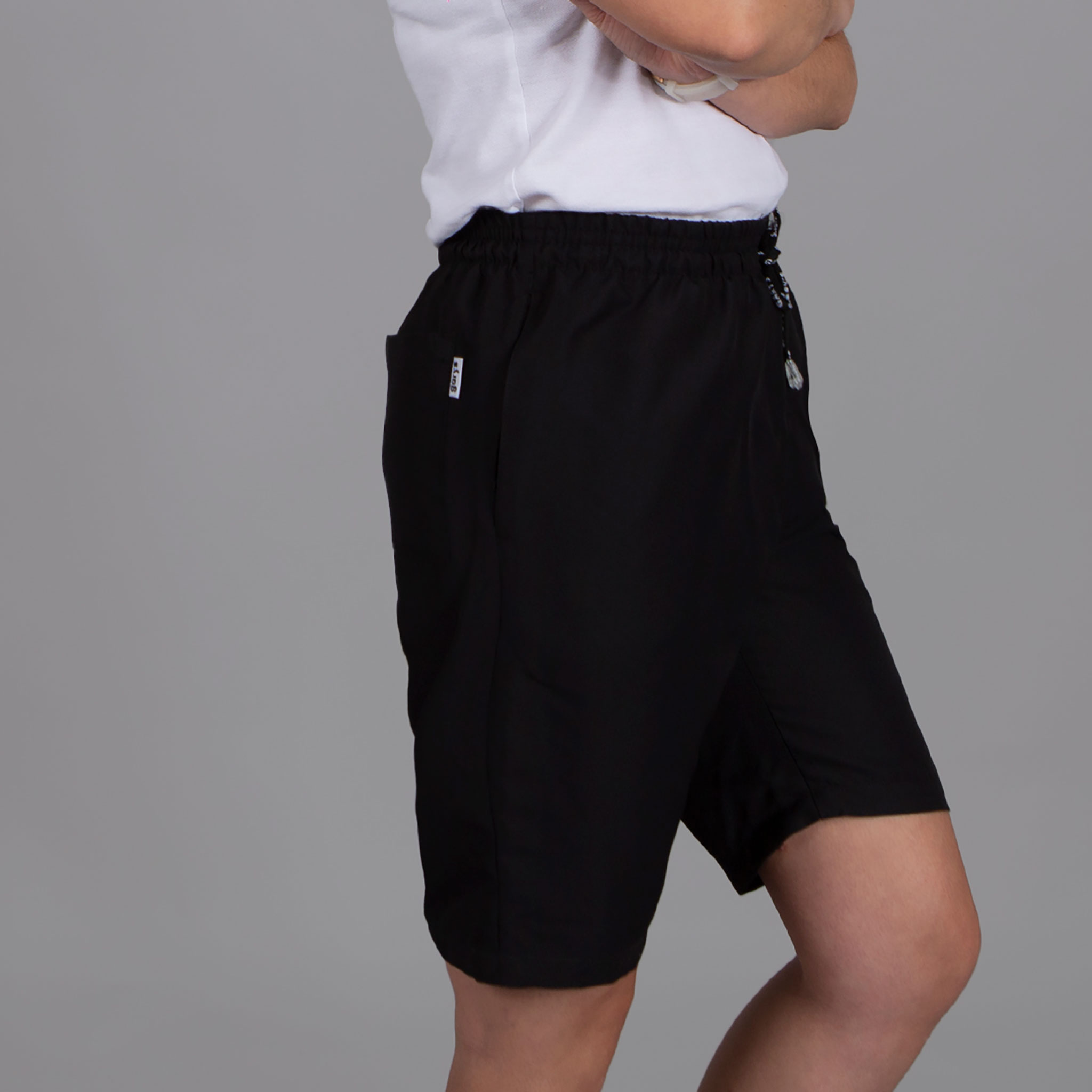 Bermuda unisex de microfibra 100% poliéster, antibacteriana, transpirable y resistente a salpicaduras de lejía diluida. Con cintura elástica, cordón exterior, dos bolsillos interiores y bolsillo trasero. Cómoda, funcional y perfecta para trabajos profesionales. Disponible en versión larga (ref. 700600).