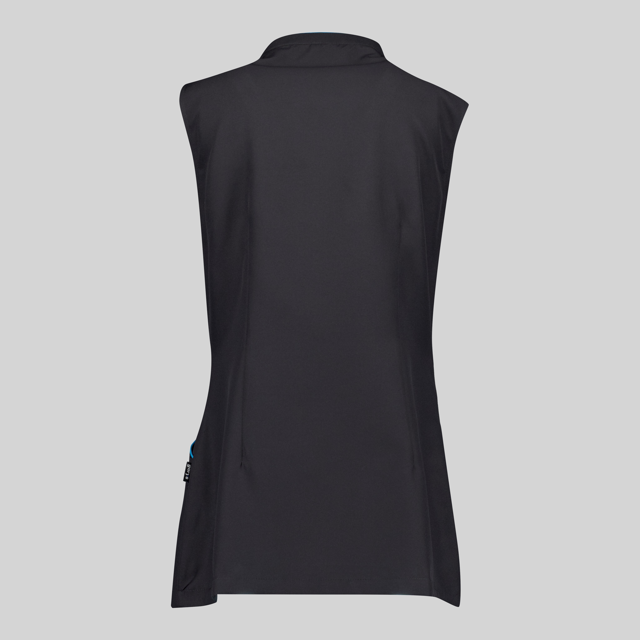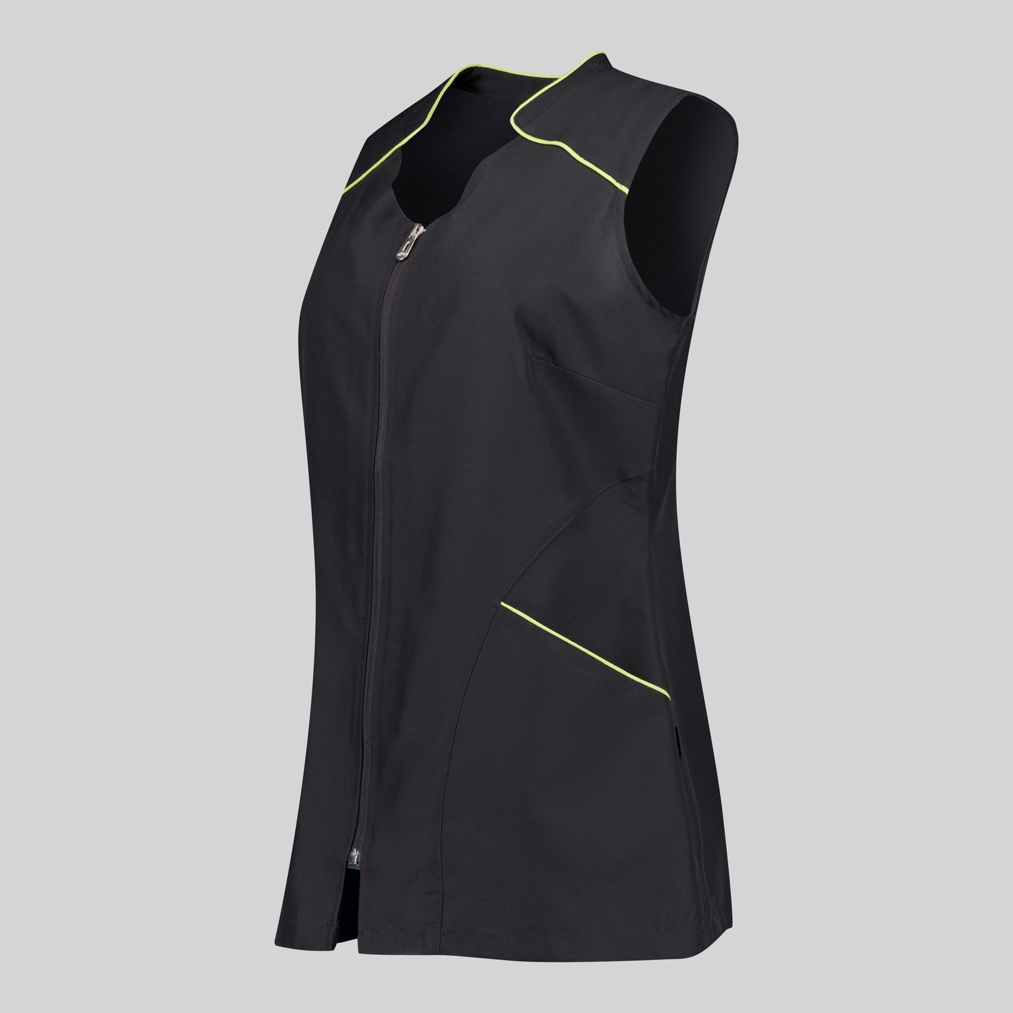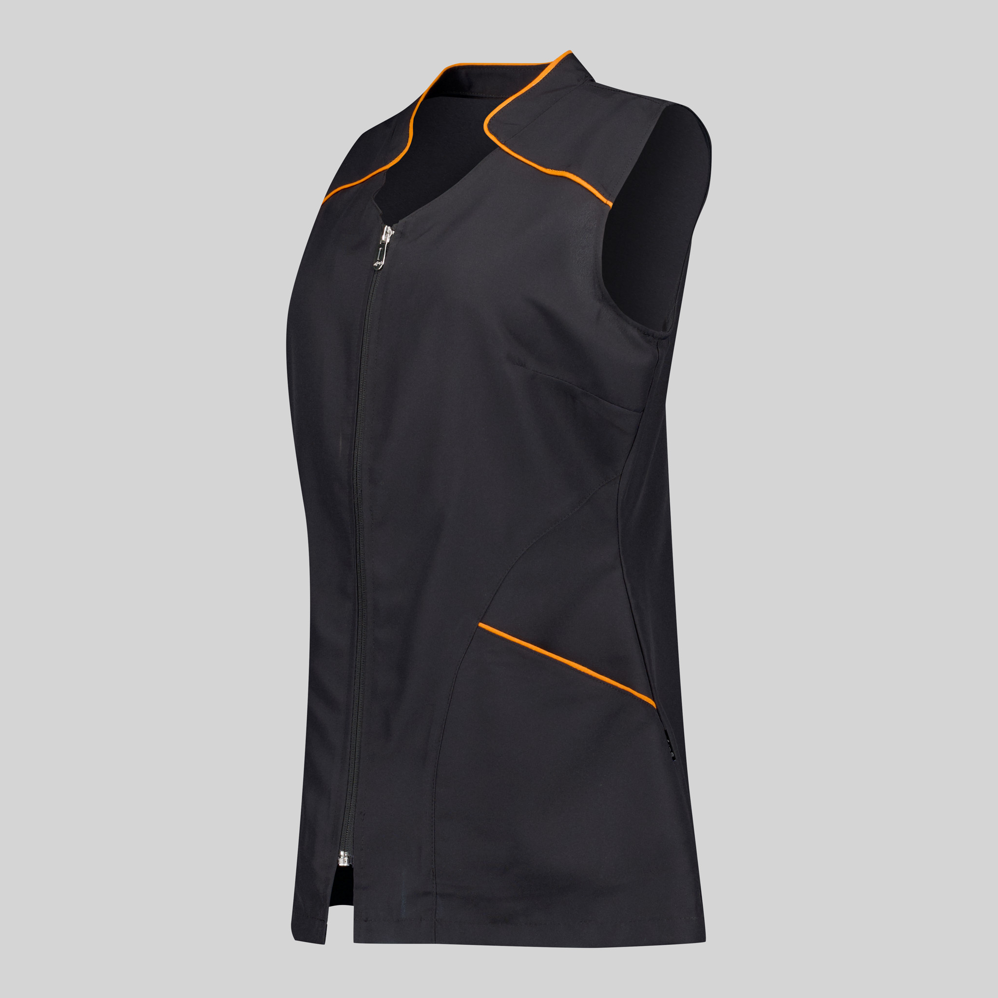 La BLUSA MUJER BEGONIA es una casaca sin mangas con cuello tirilla, escote en pico y cremallera central, diseñada para ofrecer elegancia y funcionalidad. Con dos bolsillos laterales (uno doble) y confeccionada en microfibra antibacteriana 100% poliéster, es transpirable, lavable a 90º, de secado rápido, sin plancha y repelente al cabello. Disponible en negro con vivos en cuatro colores, es ideal para peluquerías, estéticas, spas y comercios.