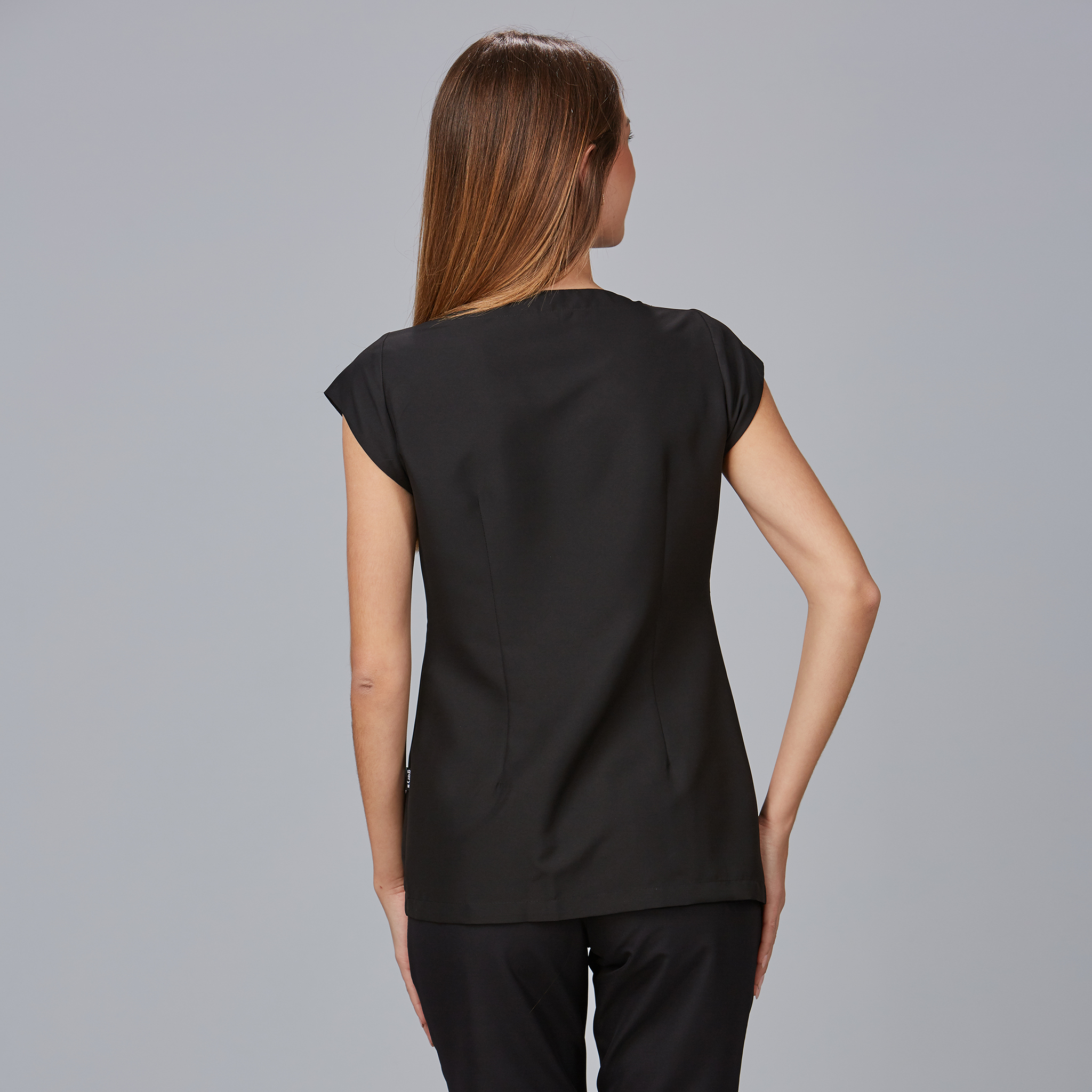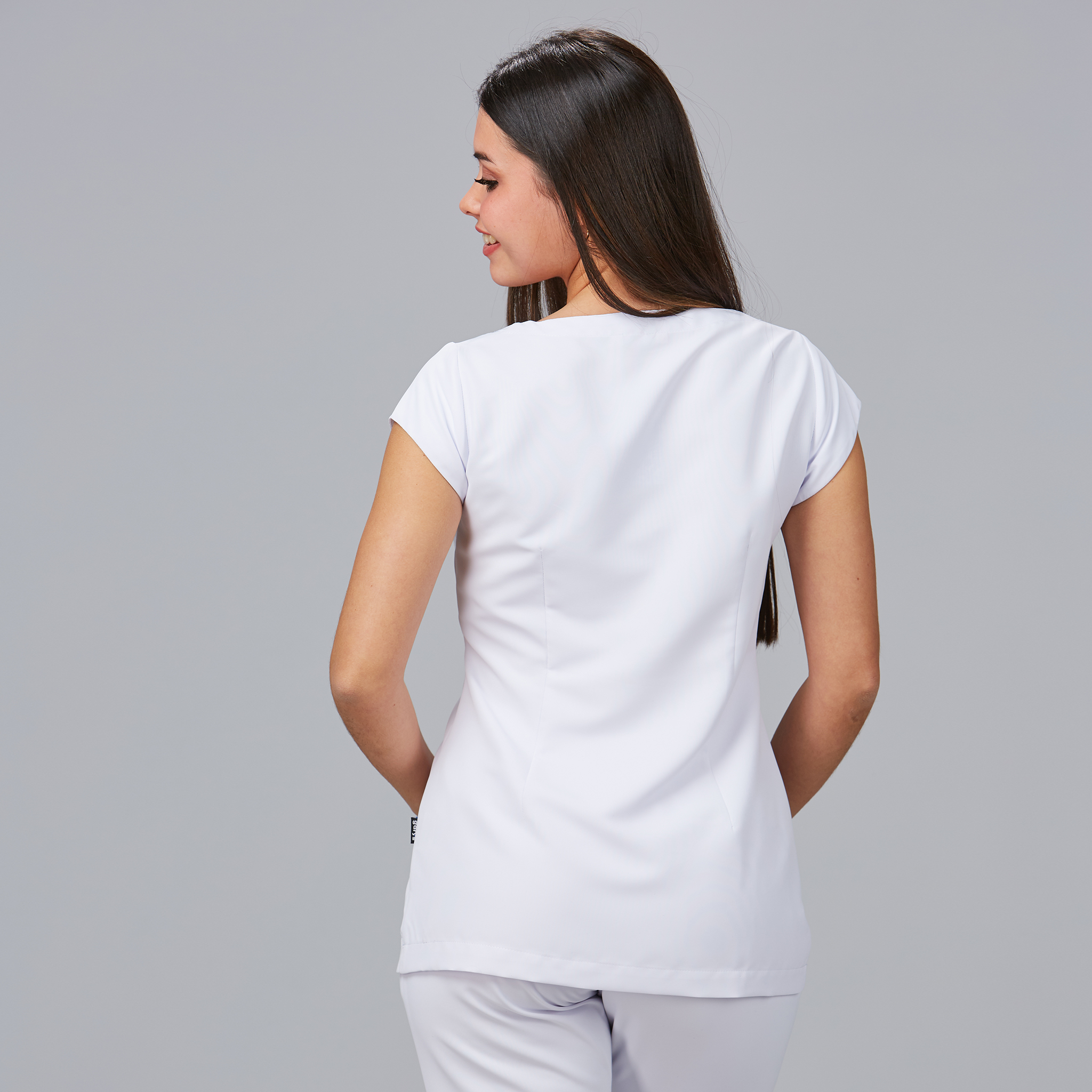 El corte semi ajustado, reforzado con pinzas en el pecho y la espalda, garantiza un ajuste favorecedor que realza la silueta sin comprometer la comodidad ni la libertad de movimiento durante largas jornadas de trabajo.
