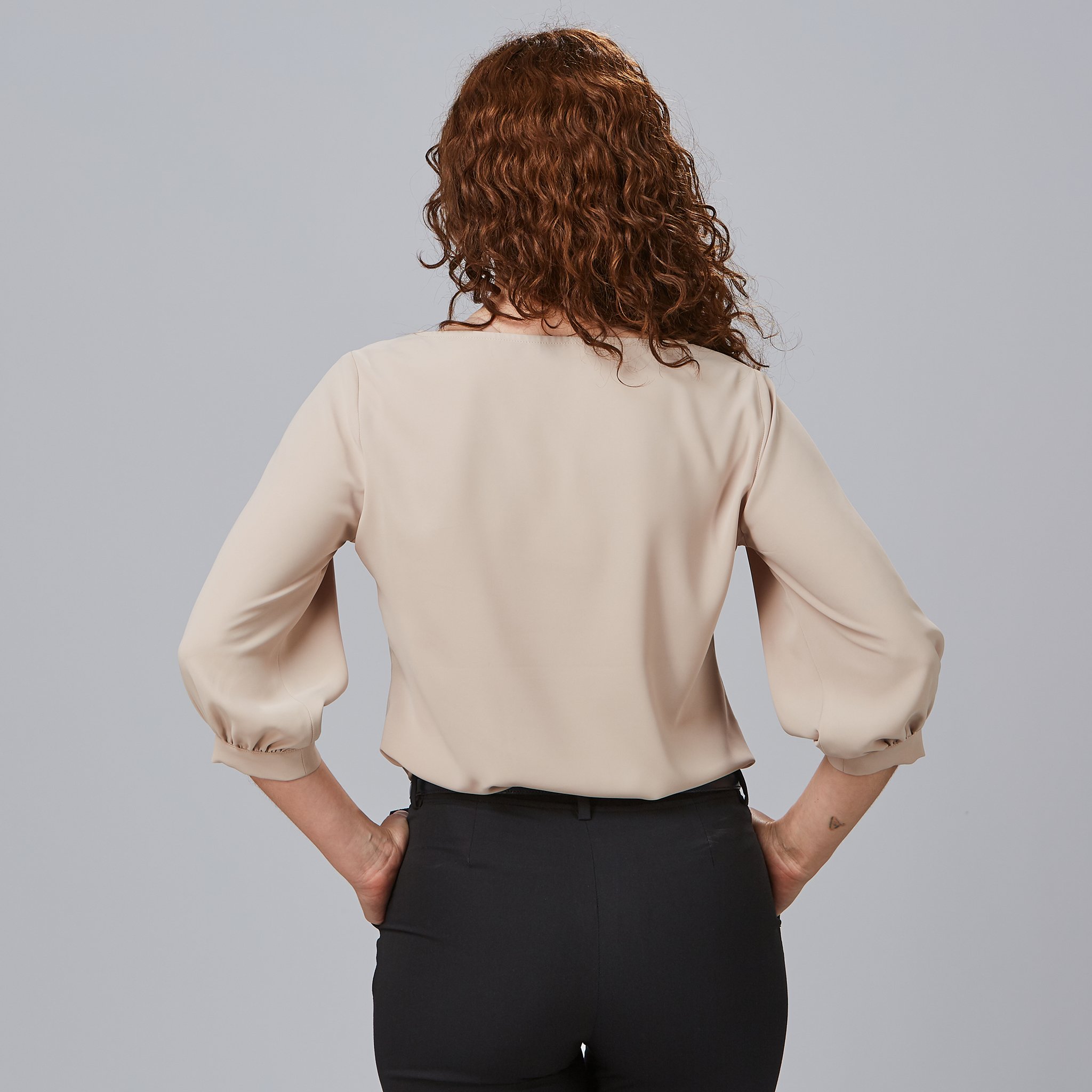 Con un diseño semi ajustado y manga 3/4 sin abotonadura, esta blusa ofrece un equilibrio perfecto entre estilo y funcionalidad. Las pinzas en el delantero aportan un ajuste favorecedor, mientras que los puños sin abotonadura brindan un acabado moderno y cómodo.
