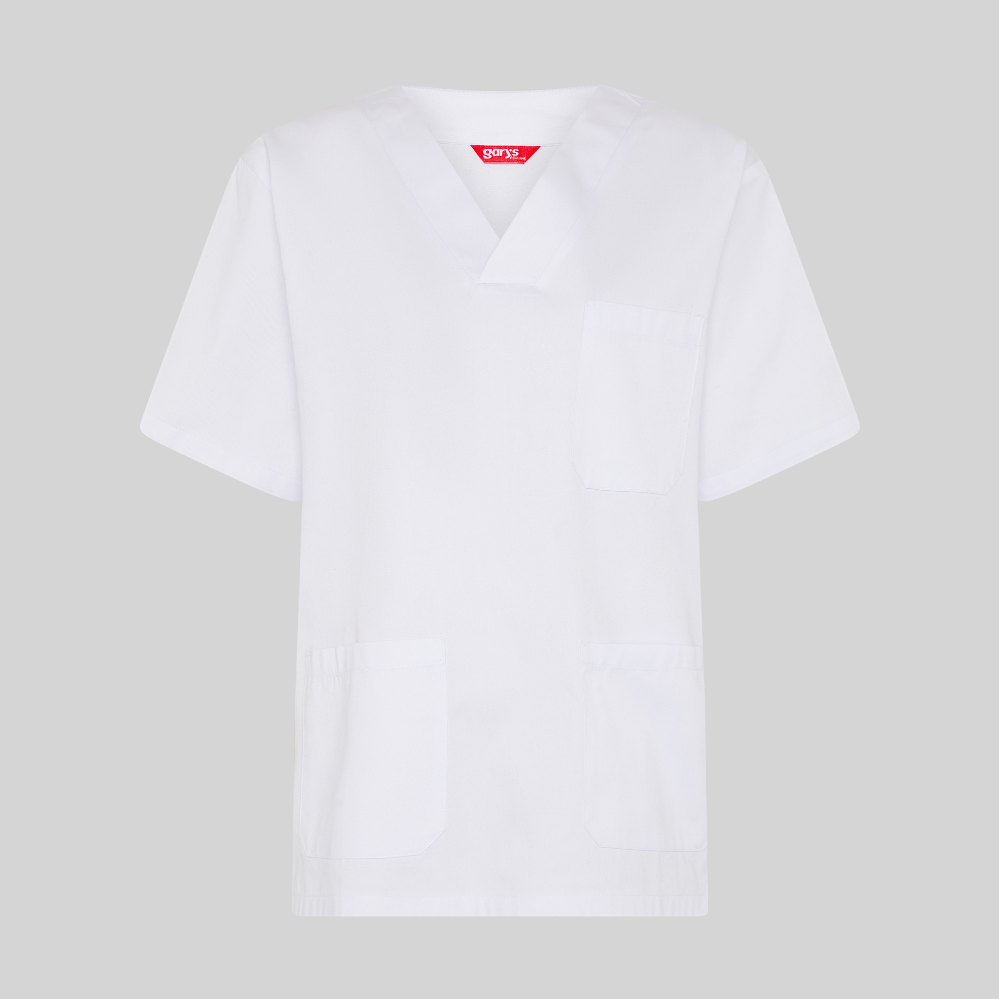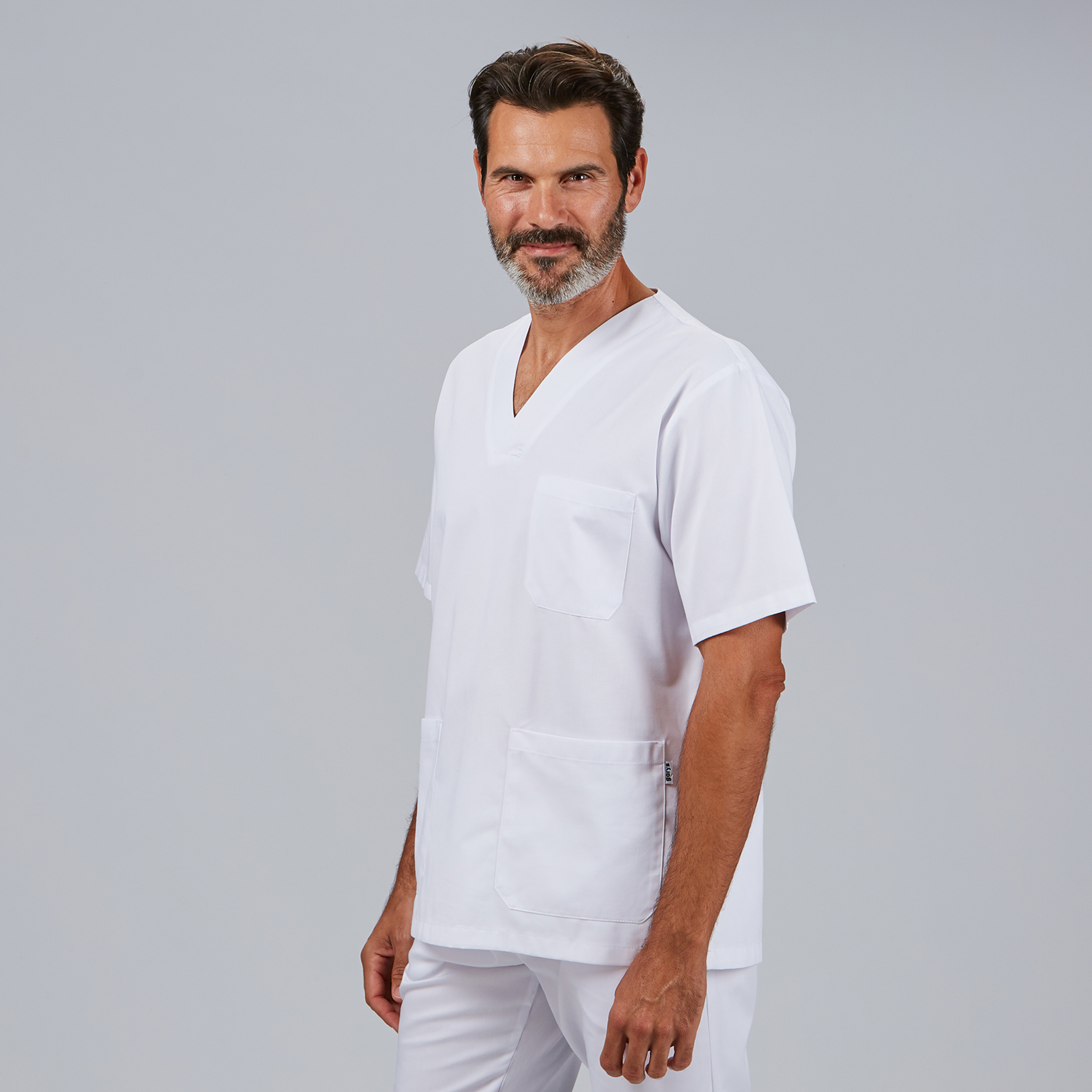 Casaca unisex de manga corta con cuello de pico, un bolsillo en el pecho y dos bolsillos delanteros. Corte holgado con aberturas laterales. Confeccionada en sarga blanca, ideal para enfermería, doctores y profesionales sanitarios. Modelo RED LINE.
