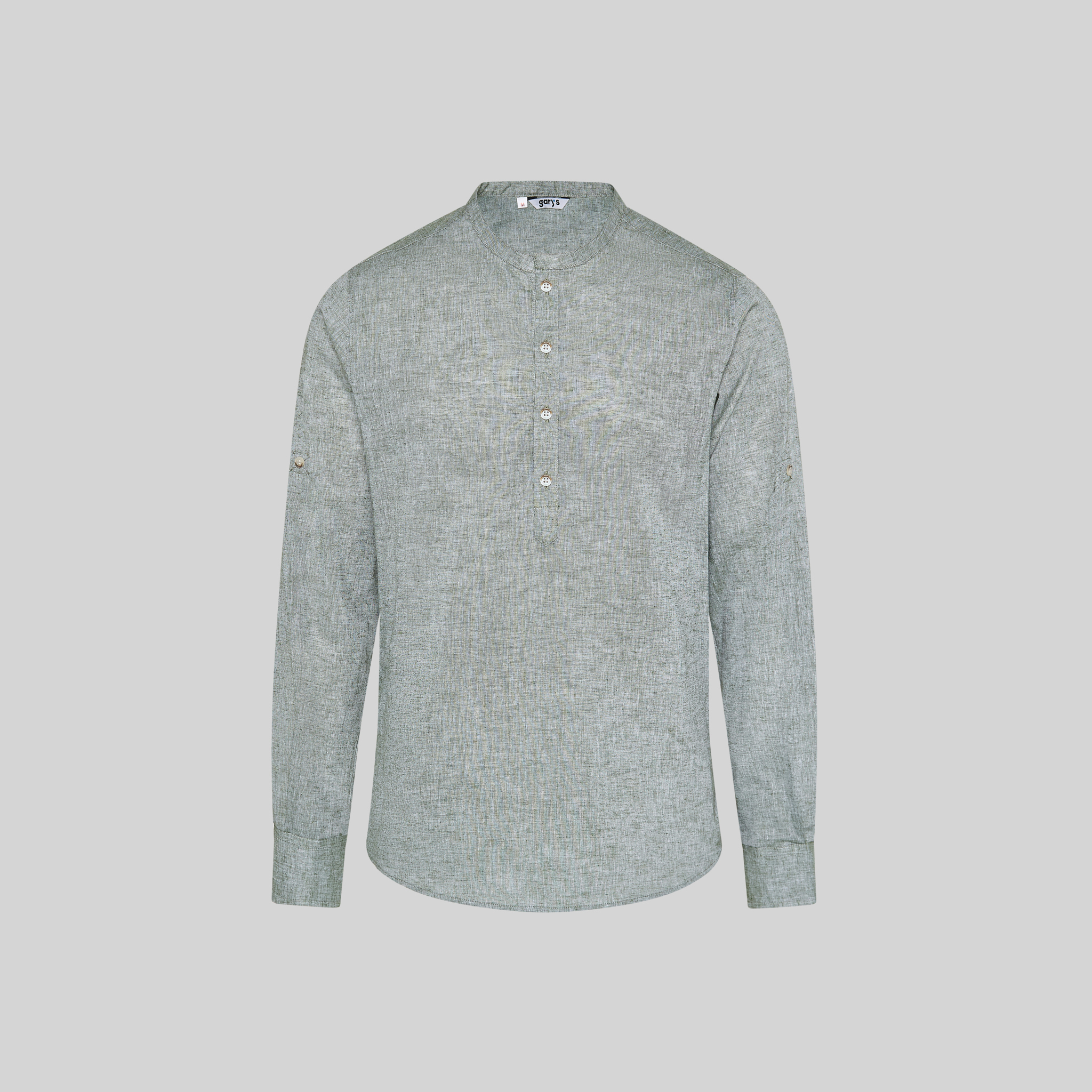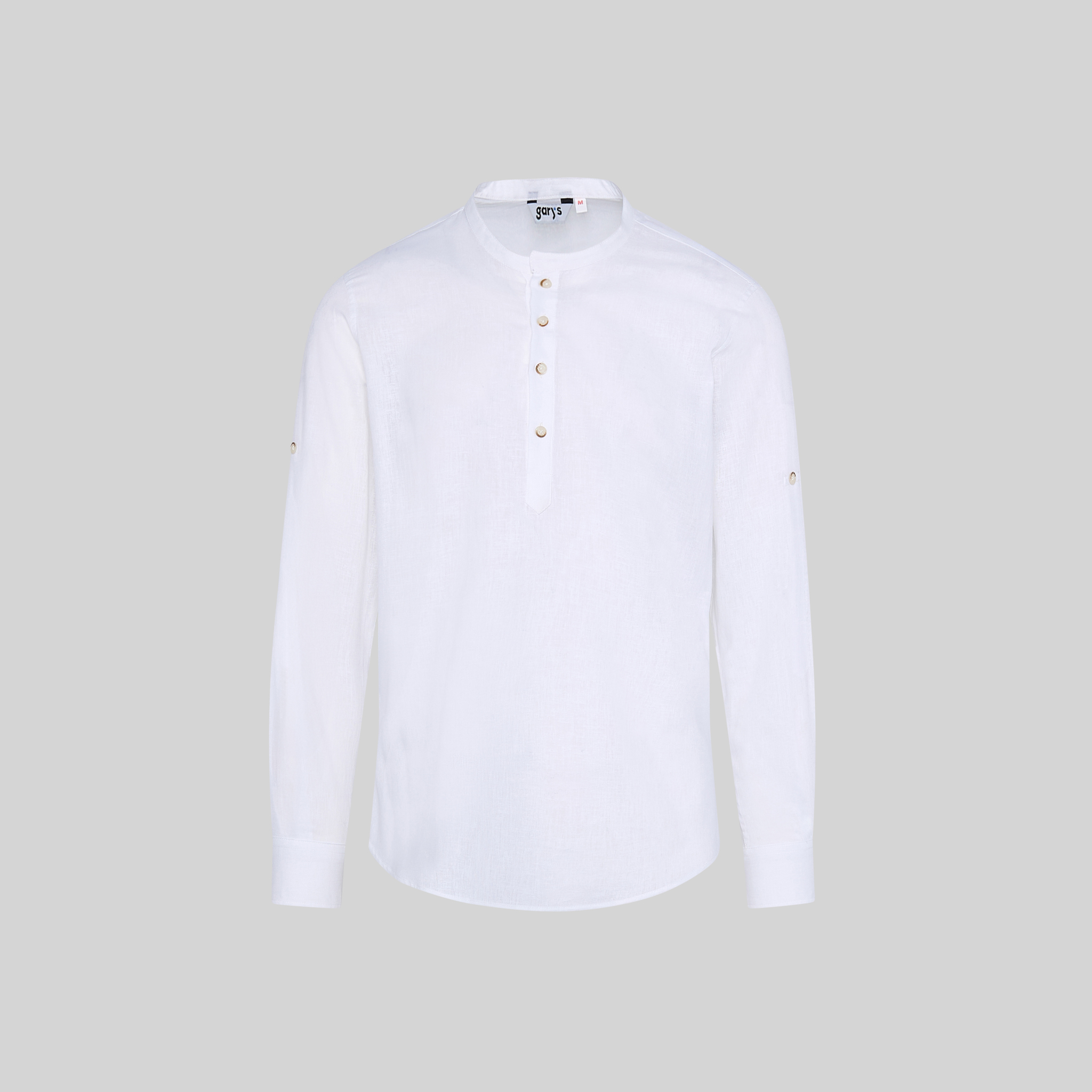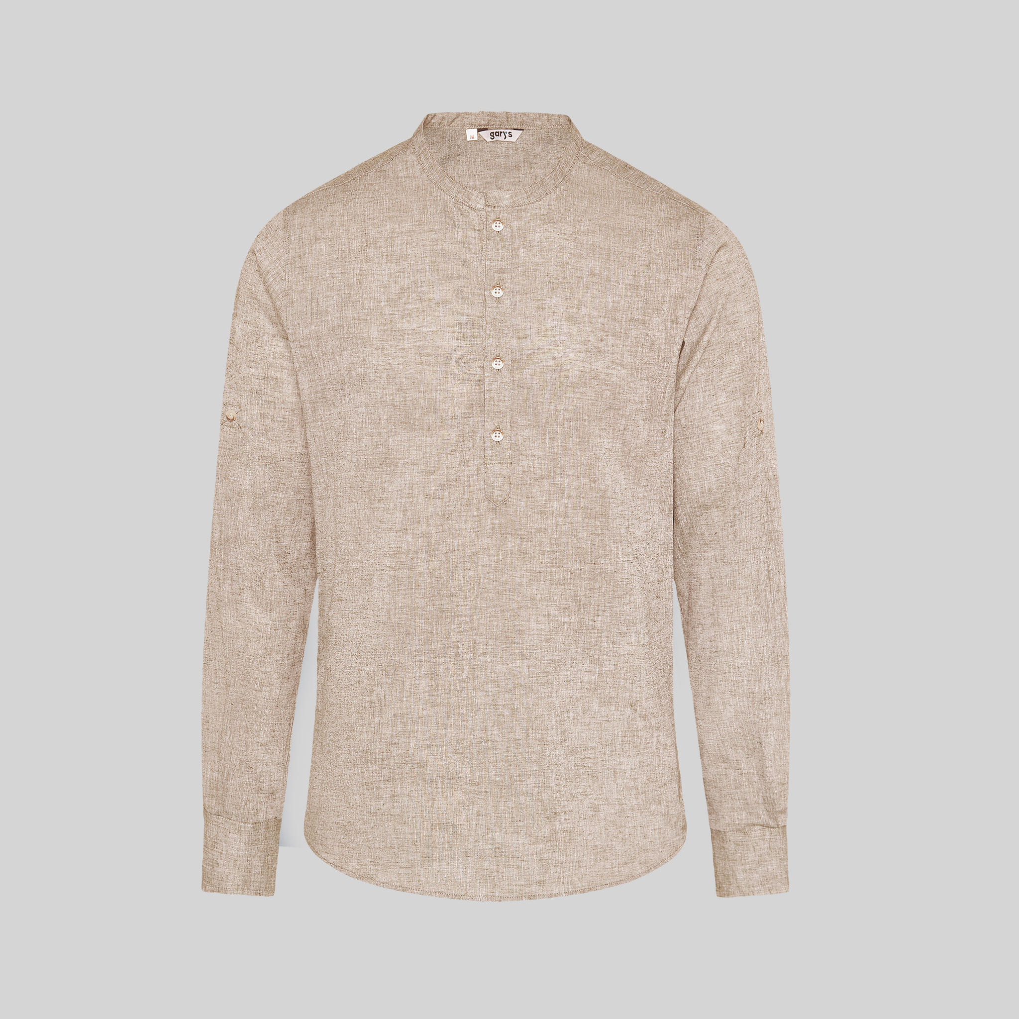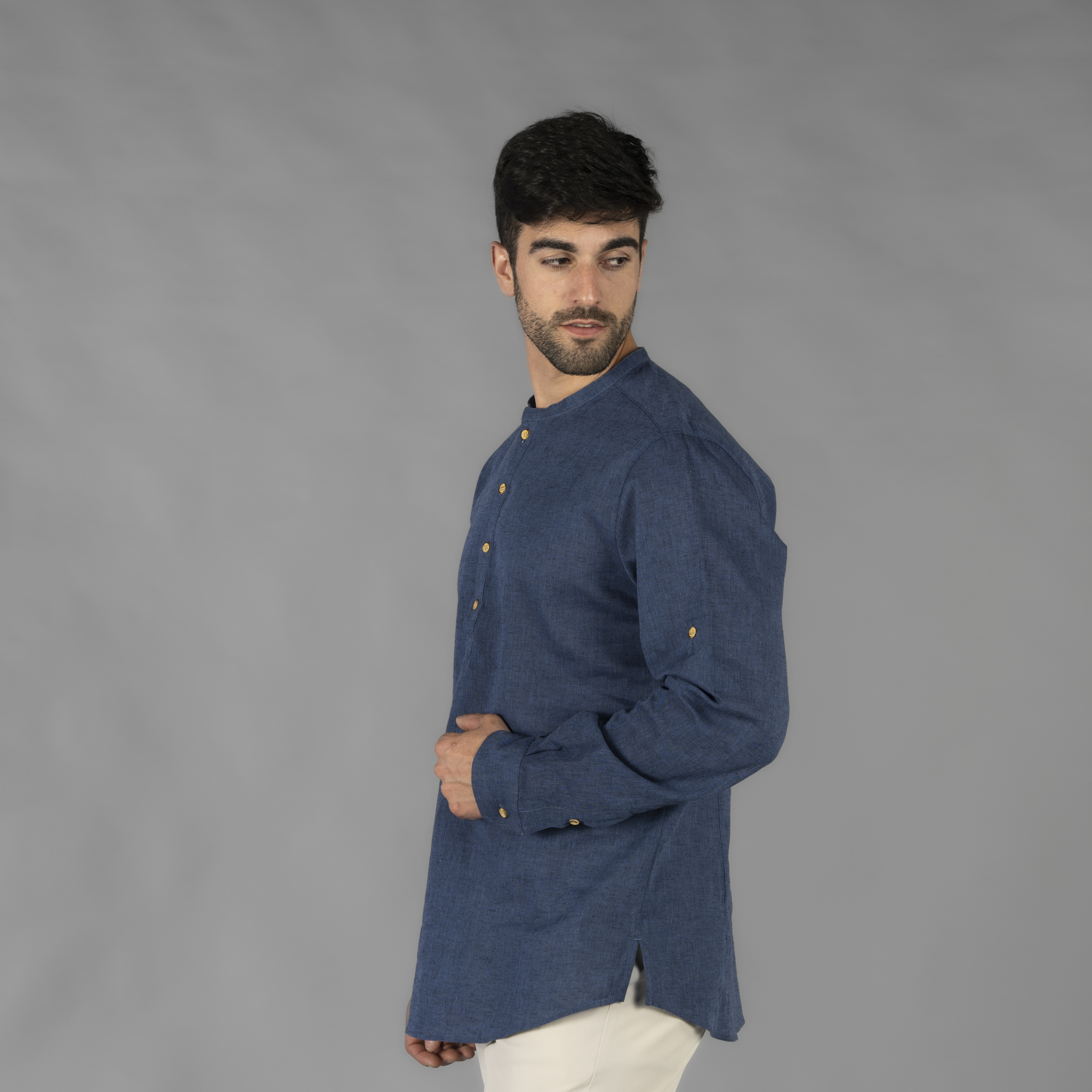 Camisa de lino (55%) y algodón (45%) con cuello mao, elegante, fresca y resistente. Con manga larga remangable, ofrece versatilidad y comodidad durante la jornada laboral. Ideal para camareros y personal de hostelería. Disponible también en modelo para mujer ref. 210006.