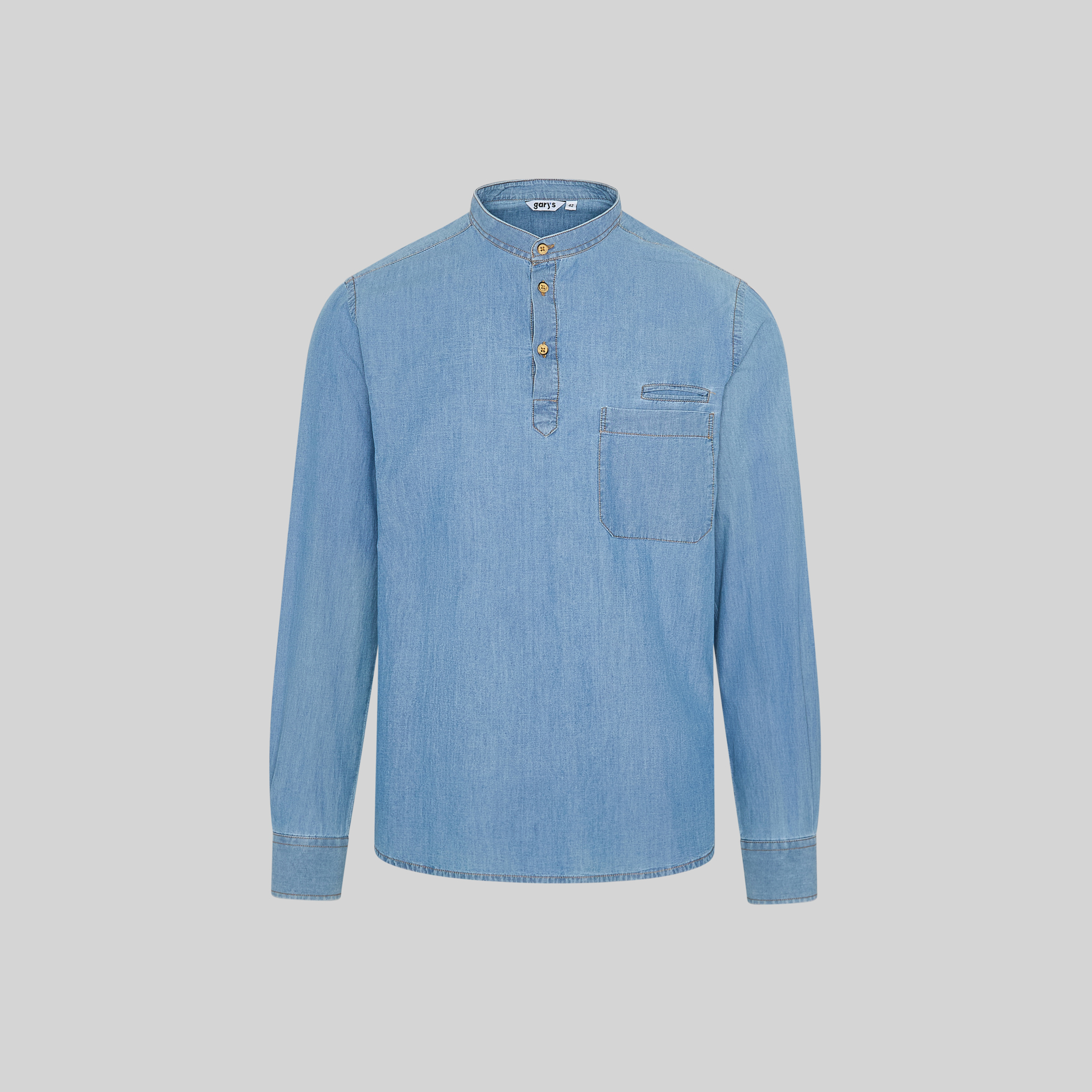 La Camisa Hombre Slim Fit Romeo, confeccionada en popelín tejano lavado, combina elegancia y funcionalidad. Con manga larga, cuello cerrado con tres botones, puños abotonados y dos bolsillos en el pecho, ofrece ajuste perfecto y estilo profesional, ideal para uniformes en hostelería, recepción u oficina.