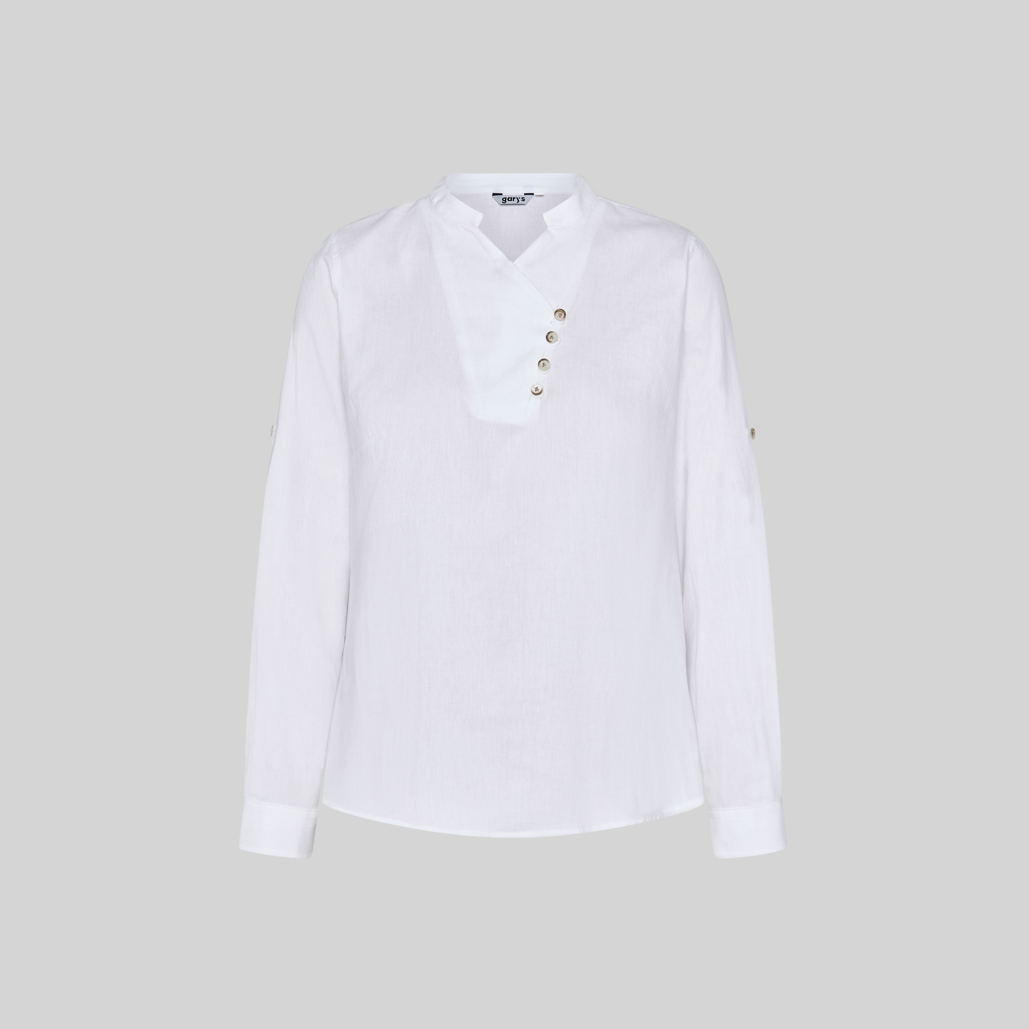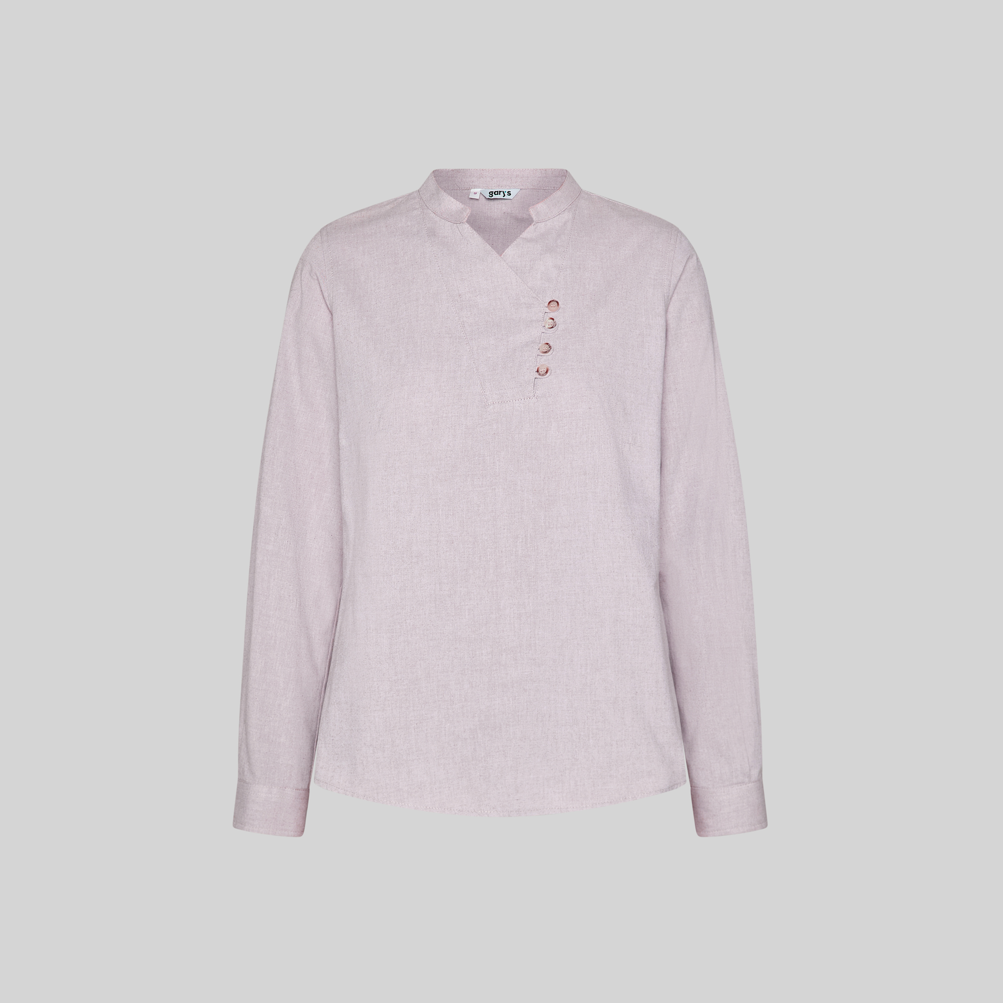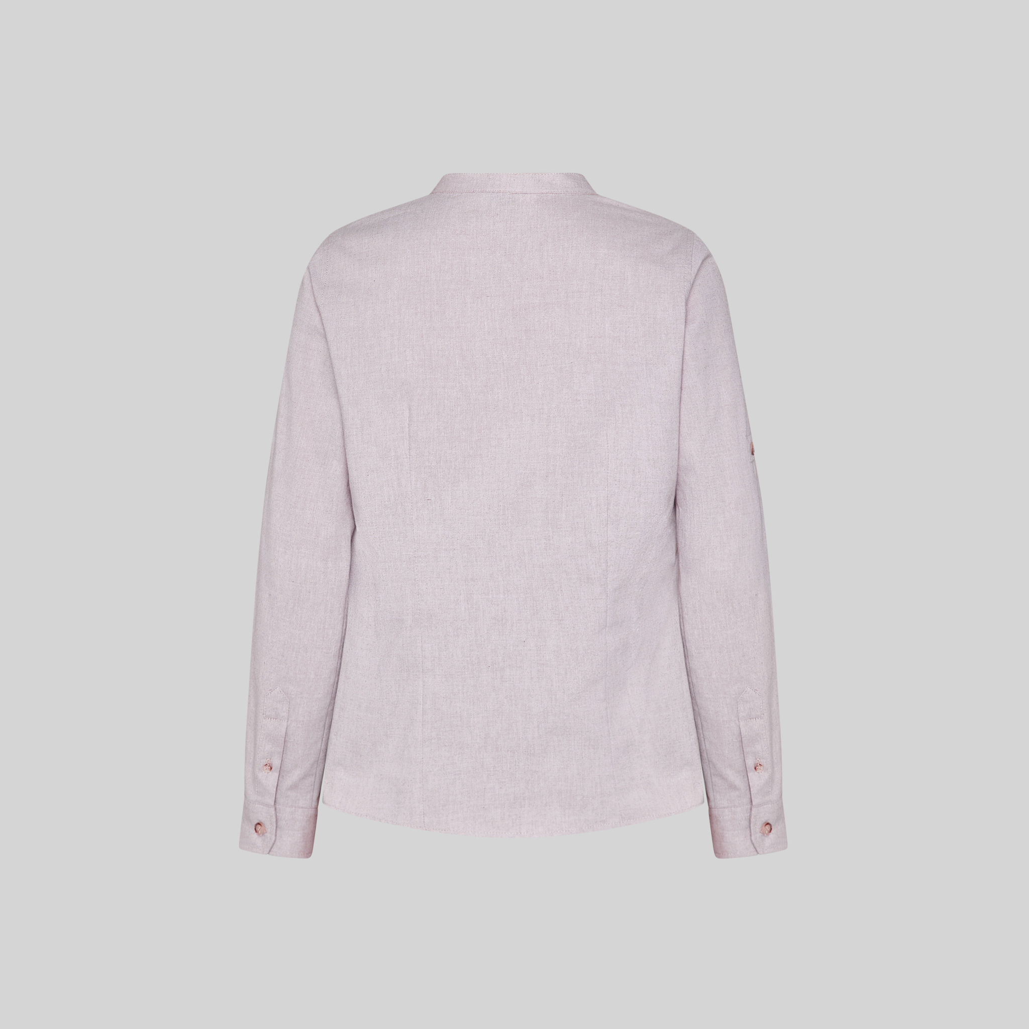 Camisa LANAY en CHAMBRAY 80% algodón – 20% poliéster, elegante y resistente. Con manga larga remangable y cuello mao de estilo moderno. Ideal para profesionales de hostelería. Disponible en versión hombre ref. 210009.