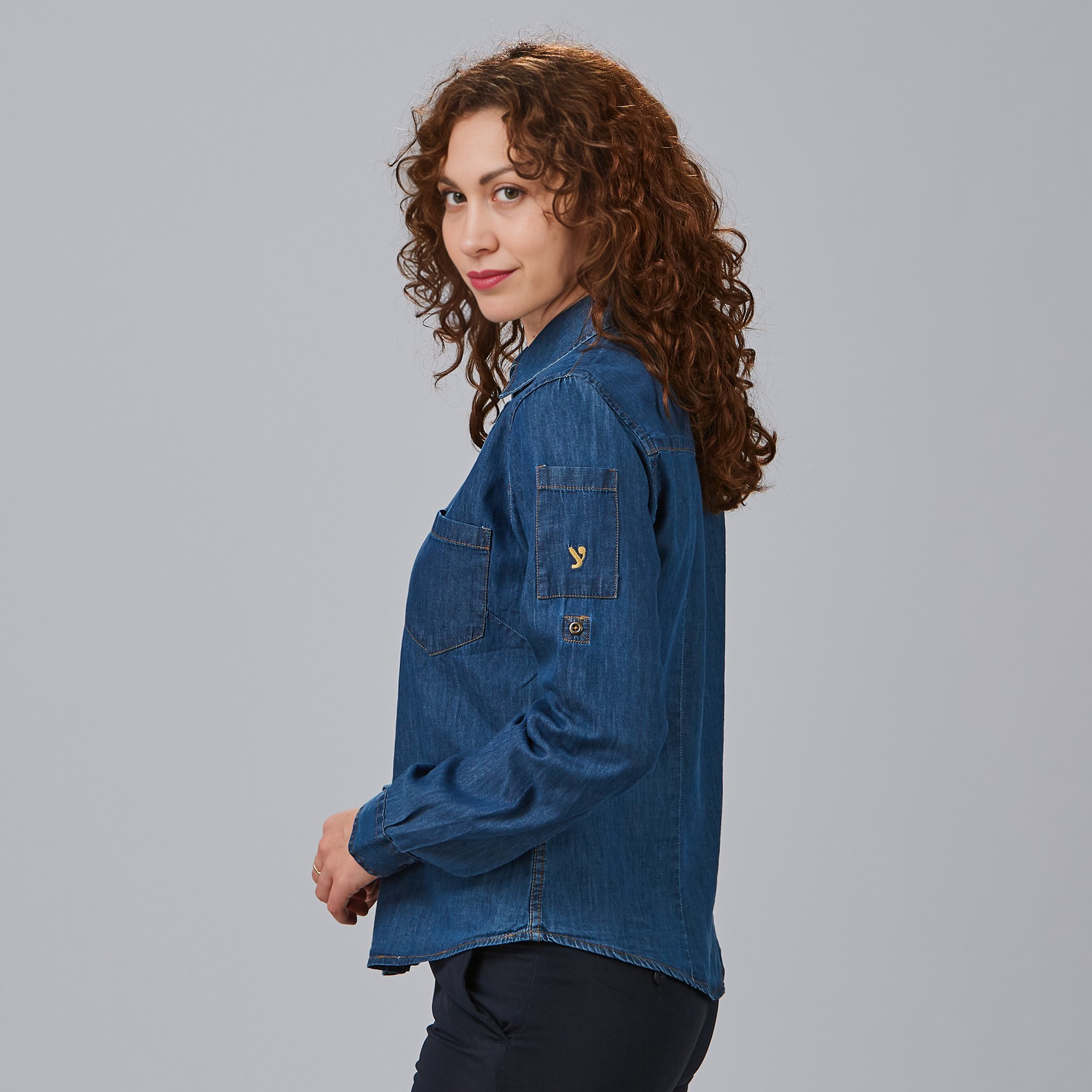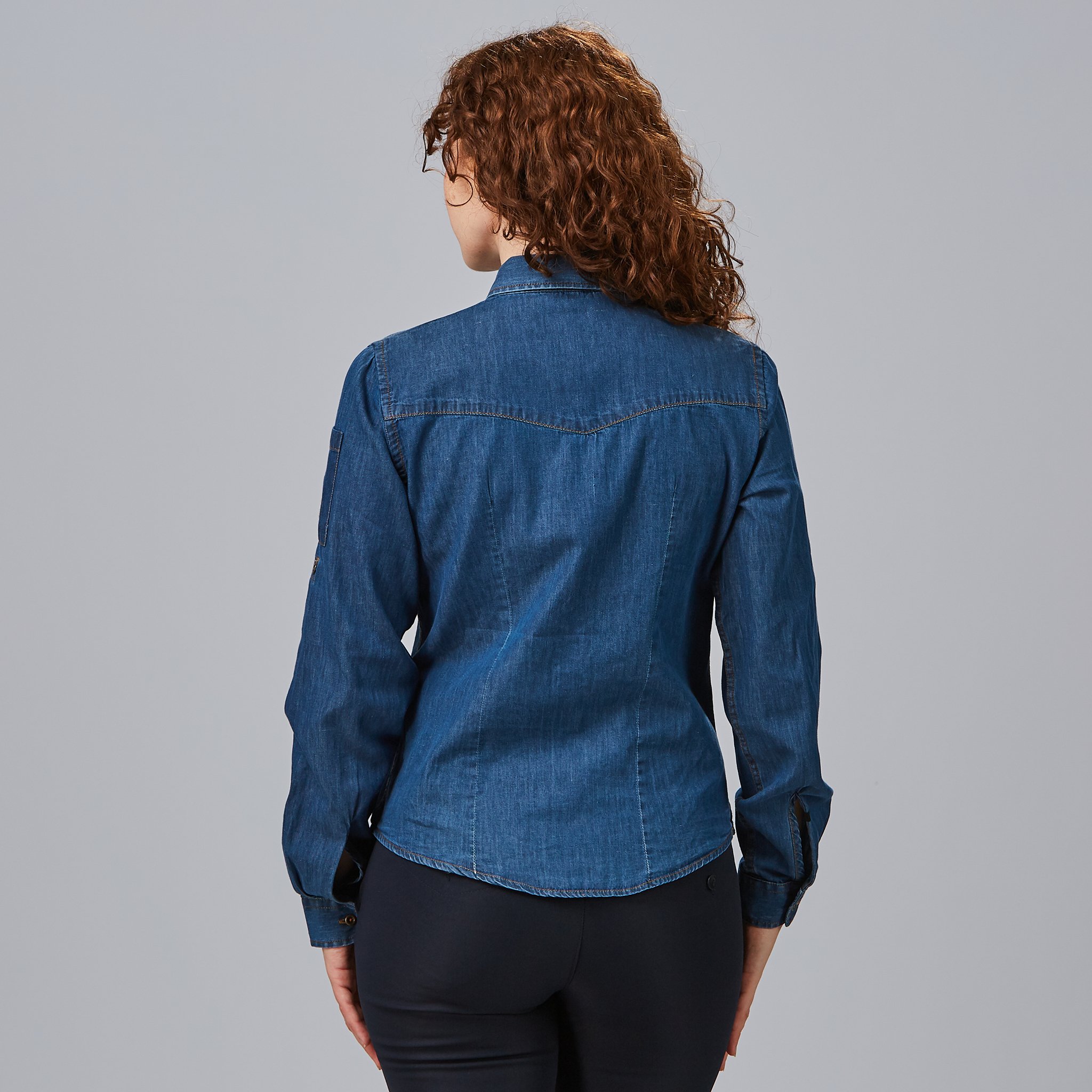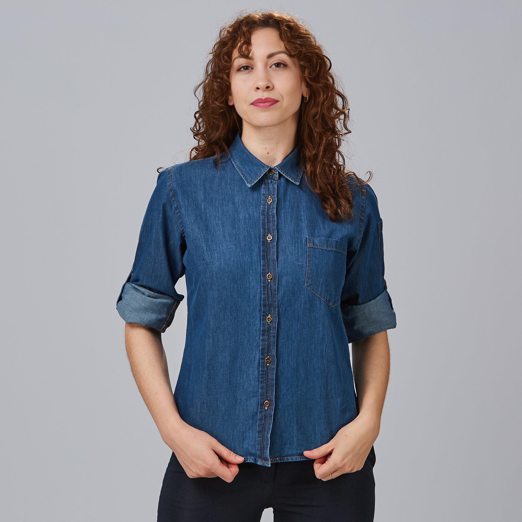 Camisa de mujer TEJANO FINO LAVADO VALERIA, de manga larga regulable, confeccionada en popelín vaquero lavado. Con pinzas que realzan la silueta y dos bolsillos funcionales, ofrece comodidad, estilo y practicidad, ideal para uniformes de hostelería y comercio.