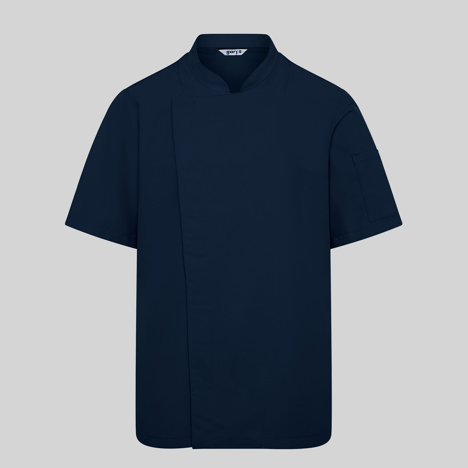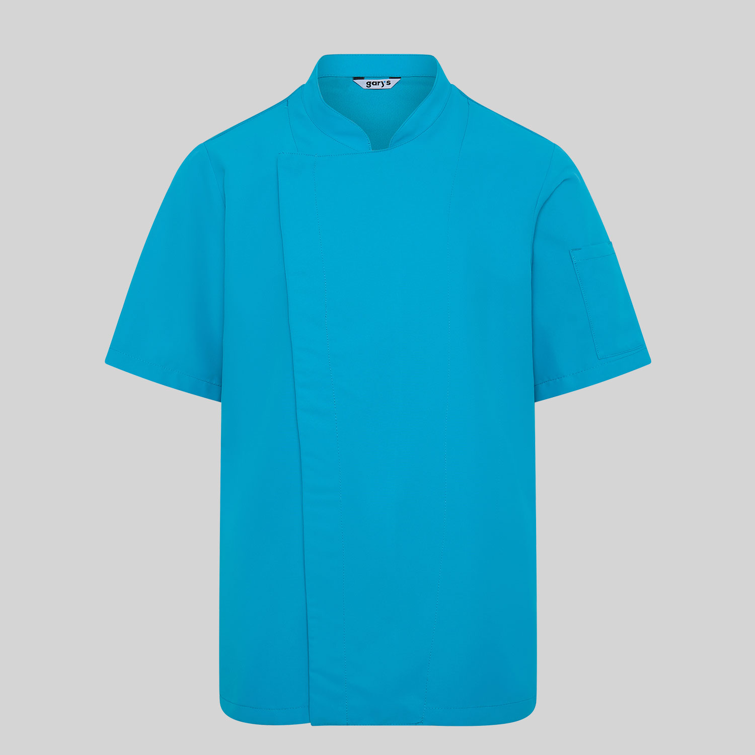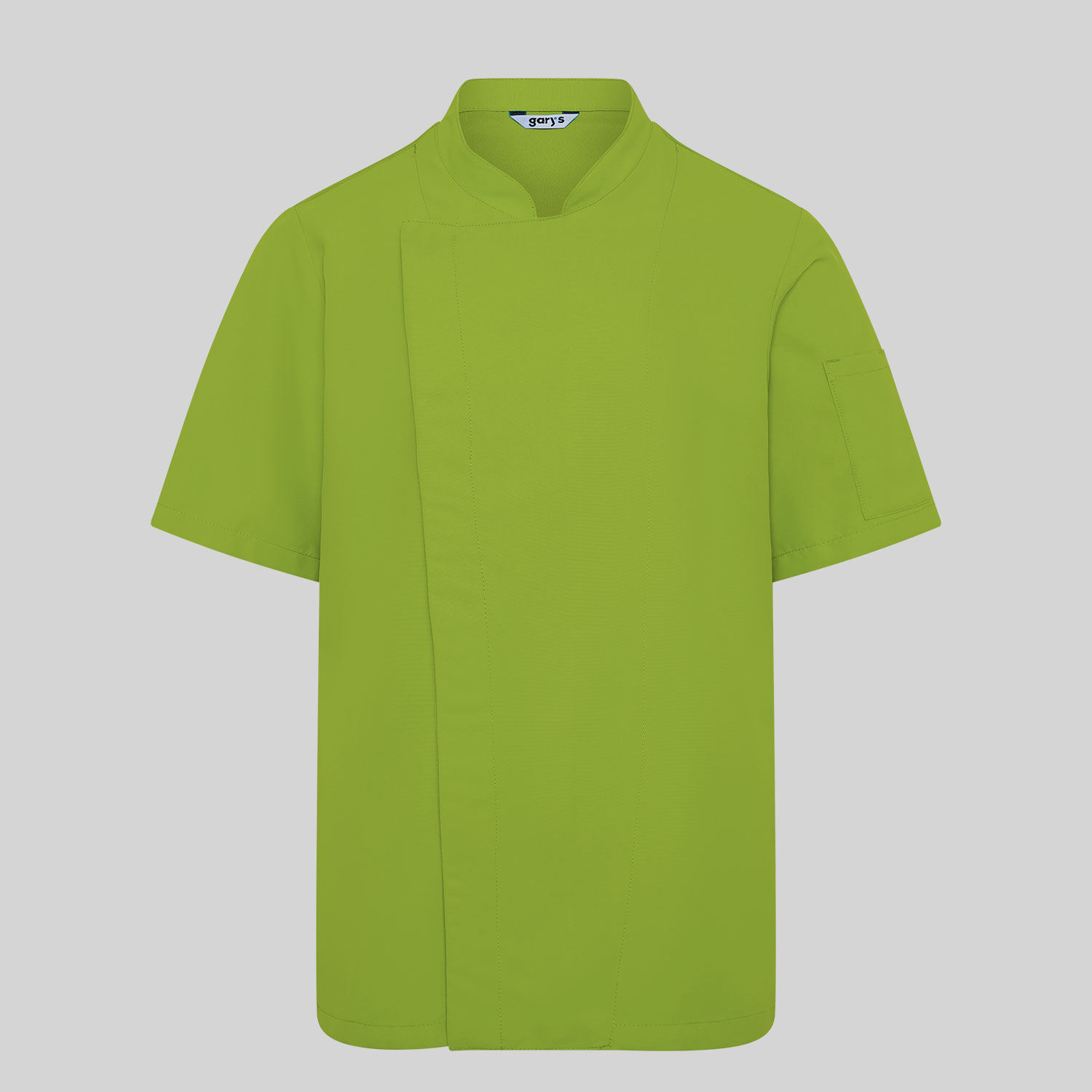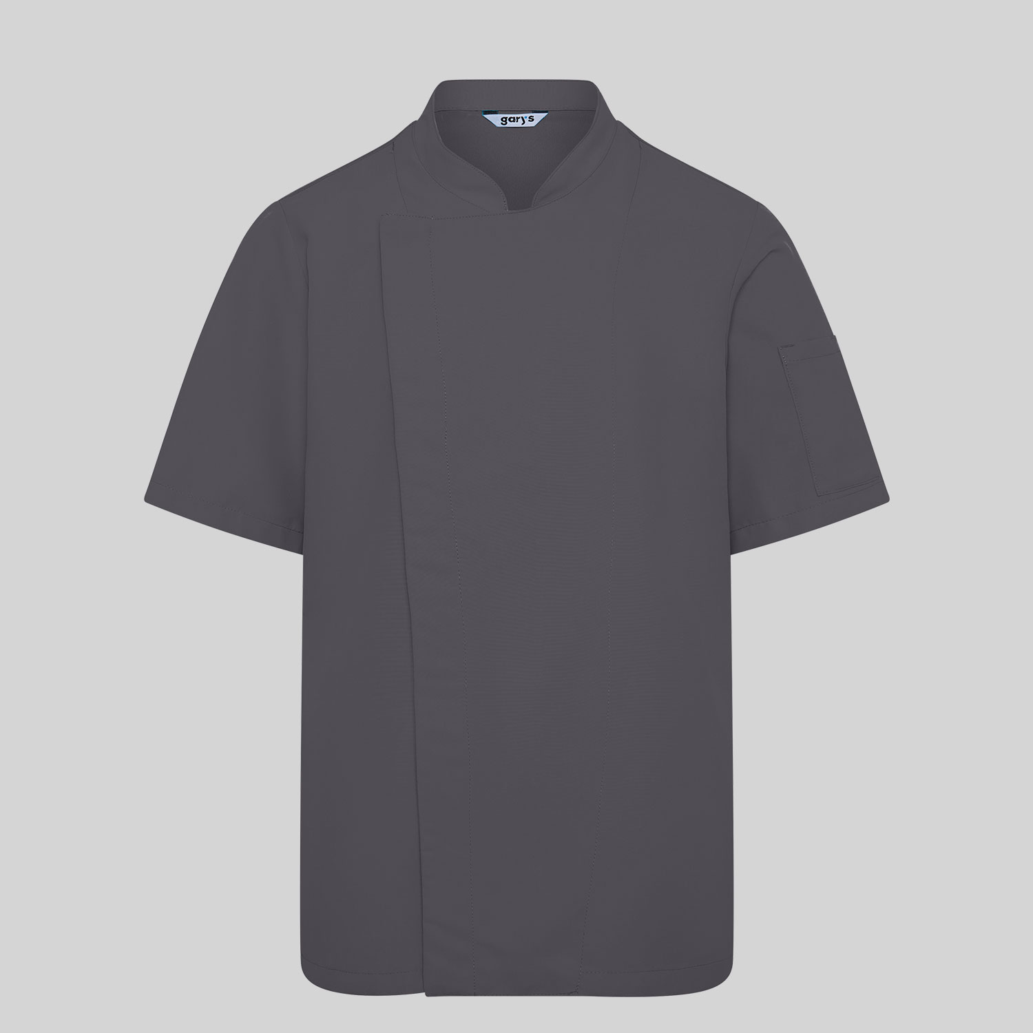 Chaqueta de cocina de hombre RIVERA en microfibra 100% poliéster, antibacteriana, transpirable y de fácil mantenimiento. Con manga corta, cuello mao y cierre cruzado oculto. Espalda con tejido Aerosilver para mayor higiene y confort. Disponible en manga larga y modelo para mujer.