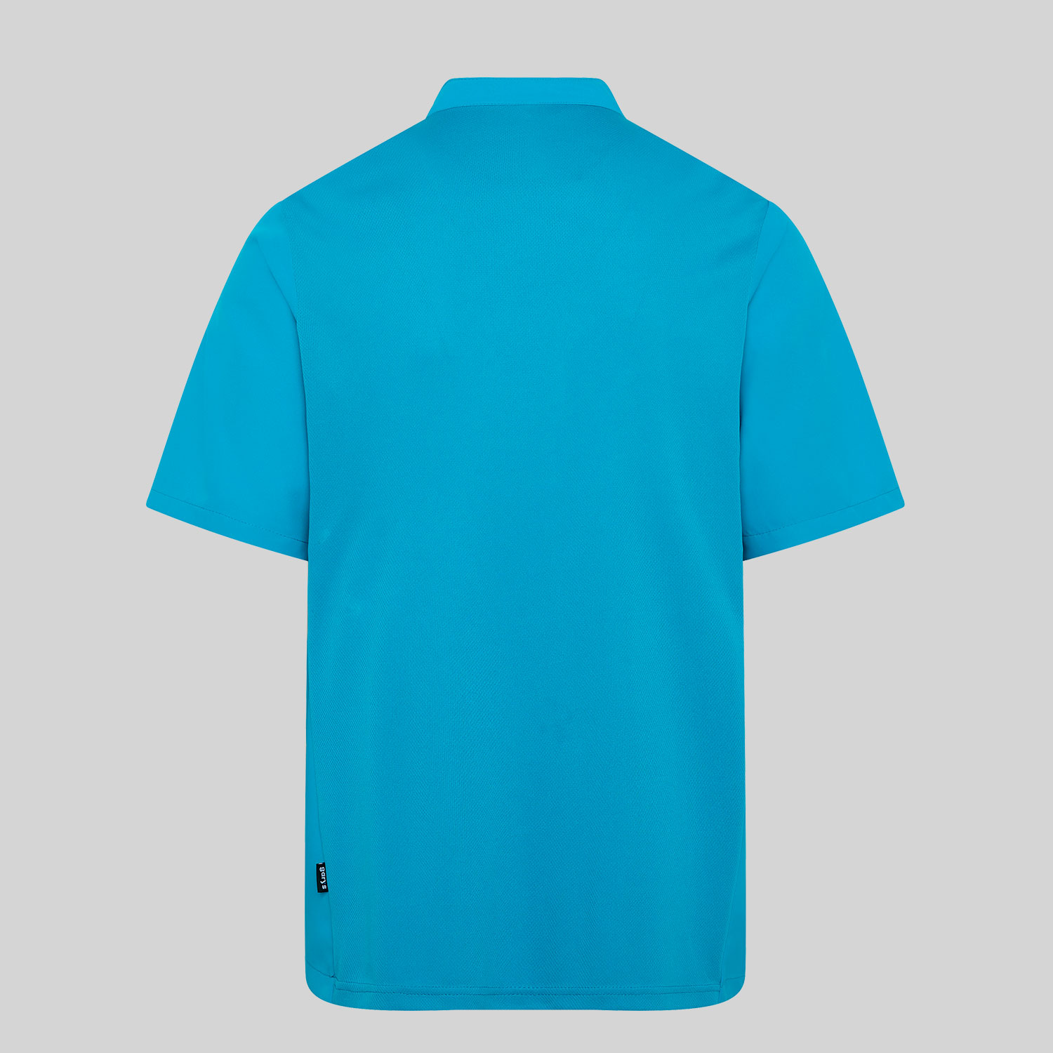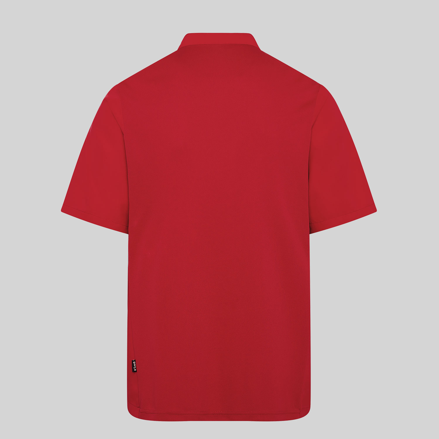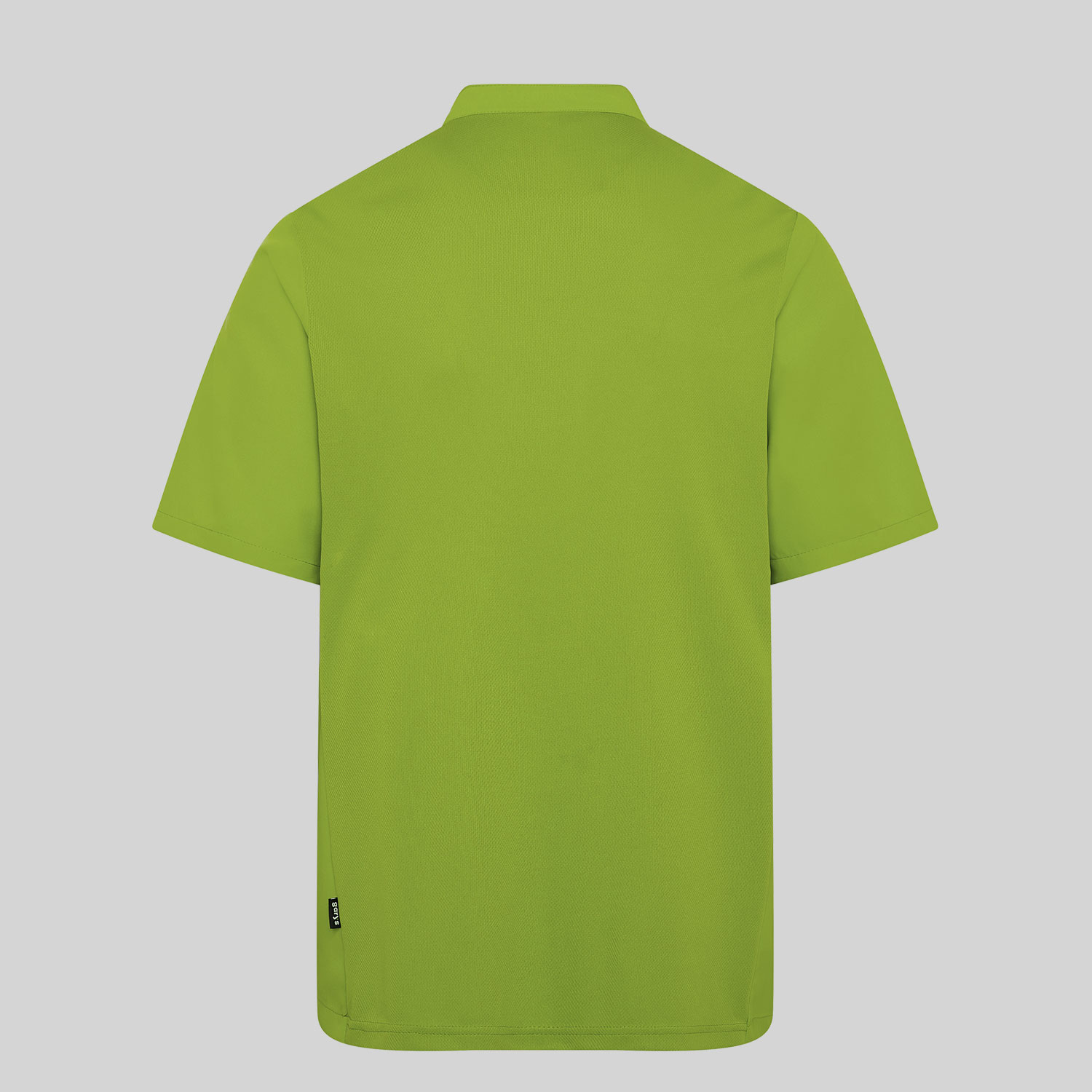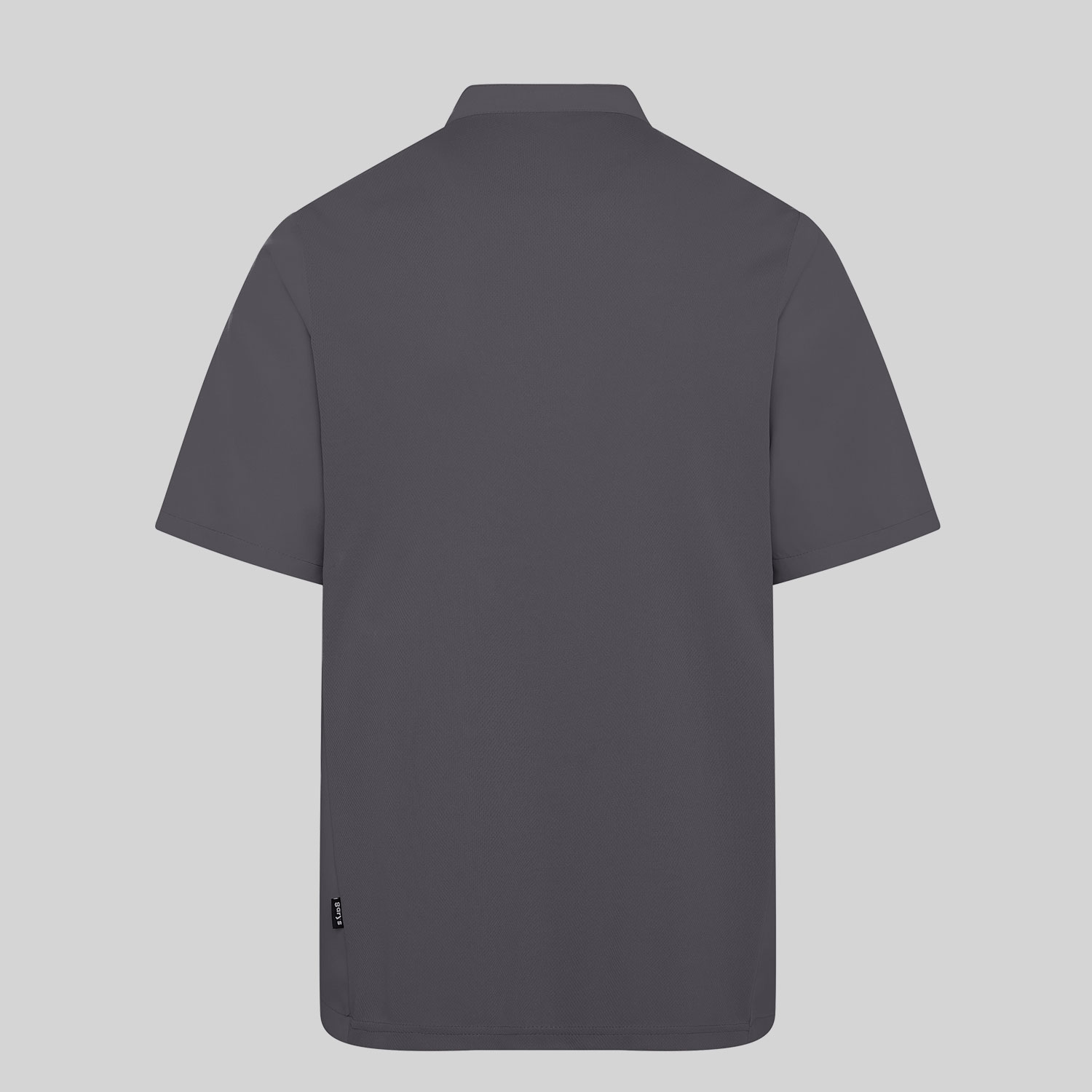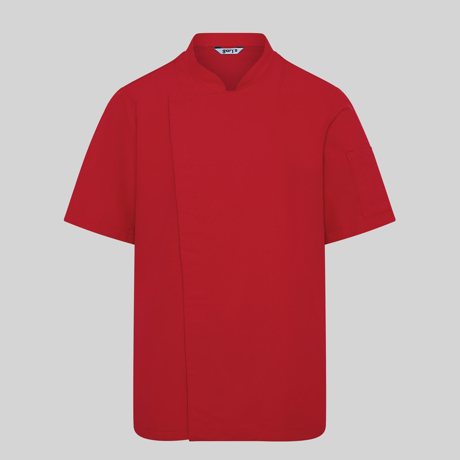 Chaqueta de cocina de hombre RIVERA en microfibra 100% poliéster, antibacteriana, transpirable y de fácil mantenimiento. Con manga corta, cuello mao y cierre cruzado oculto. Espalda con tejido Aerosilver para mayor higiene y confort. Disponible en manga larga y modelo para mujer.
