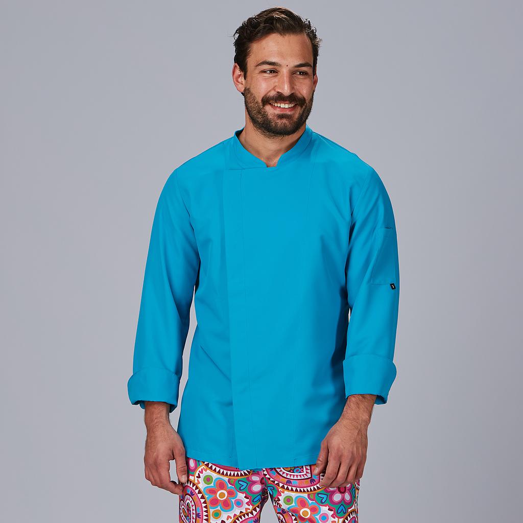 Chaqueta de cocina de hombre VIDAL en microfibra 100% poliéster, transpirable, antibacteriana y repelente al cabello. Diseño elegante con cuello mao, manga larga y cierre cruzado oculto. Con tejido Aerosilver en la espalda. Disponible en manga corta y modelo para mujer.