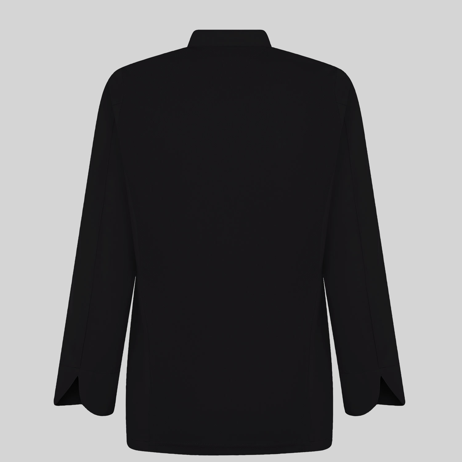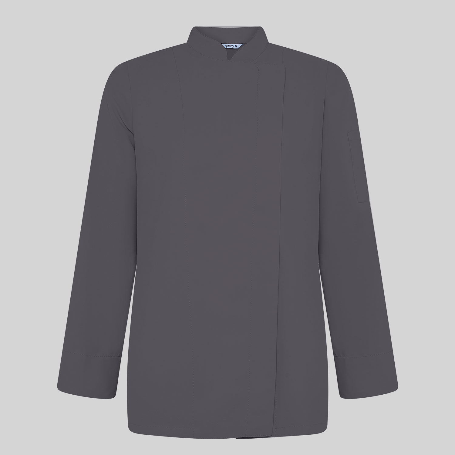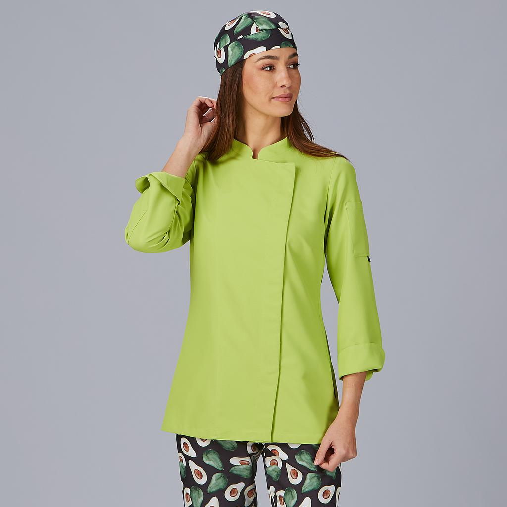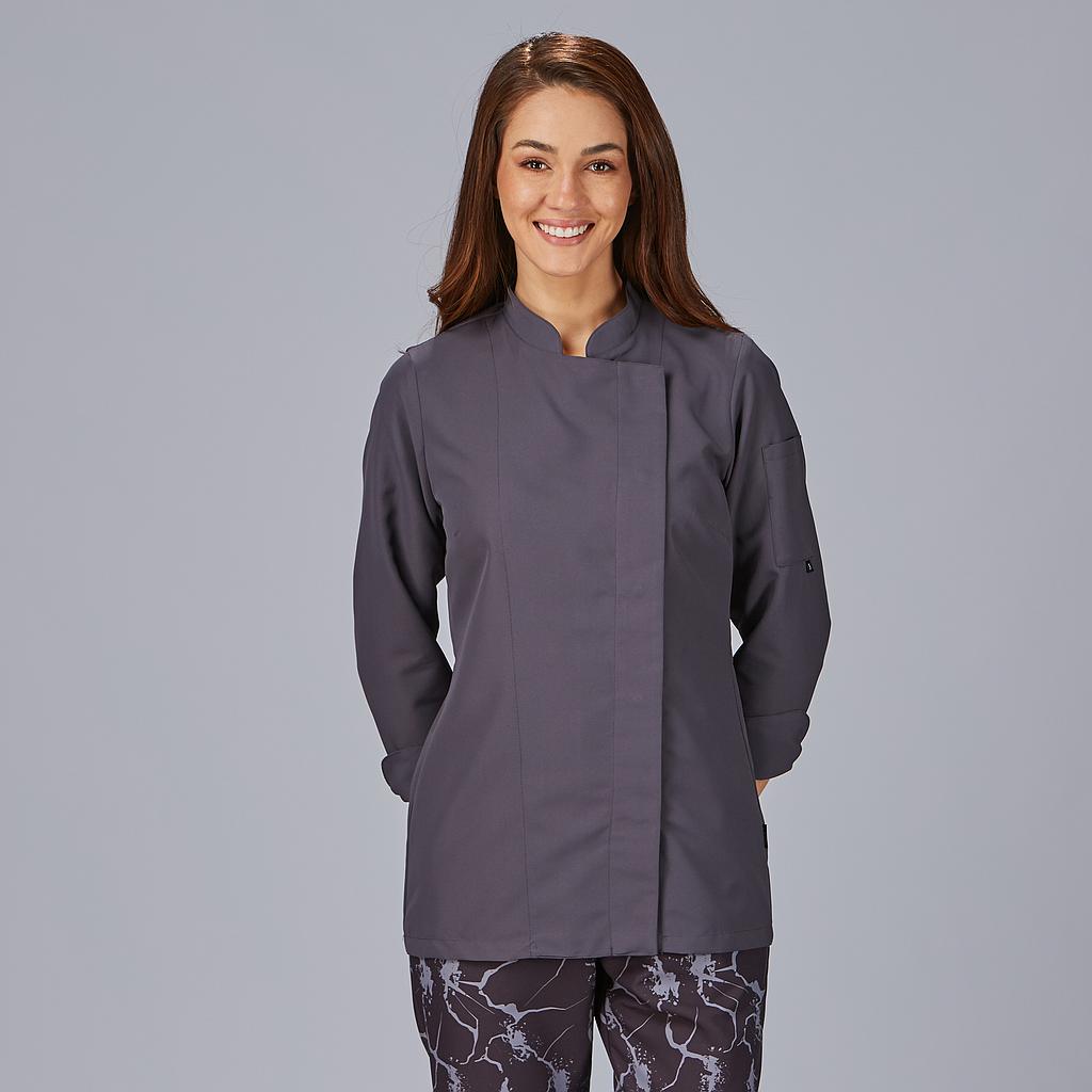 Chaqueta de cocina unisex MIRANDA en microfibra 100% poliéster, transpirable, resistente a lejía, de secado rápido y sin necesidad de plancha. Con manga larga, cuello mao, puños vueltos y cierre cruzado oculto. Incluye bolsillo en la manga y tejido AEROSILVER en la espalda. Disponible en manga corta y modelo para hombre. Ideal para chefs y personal de cocina.