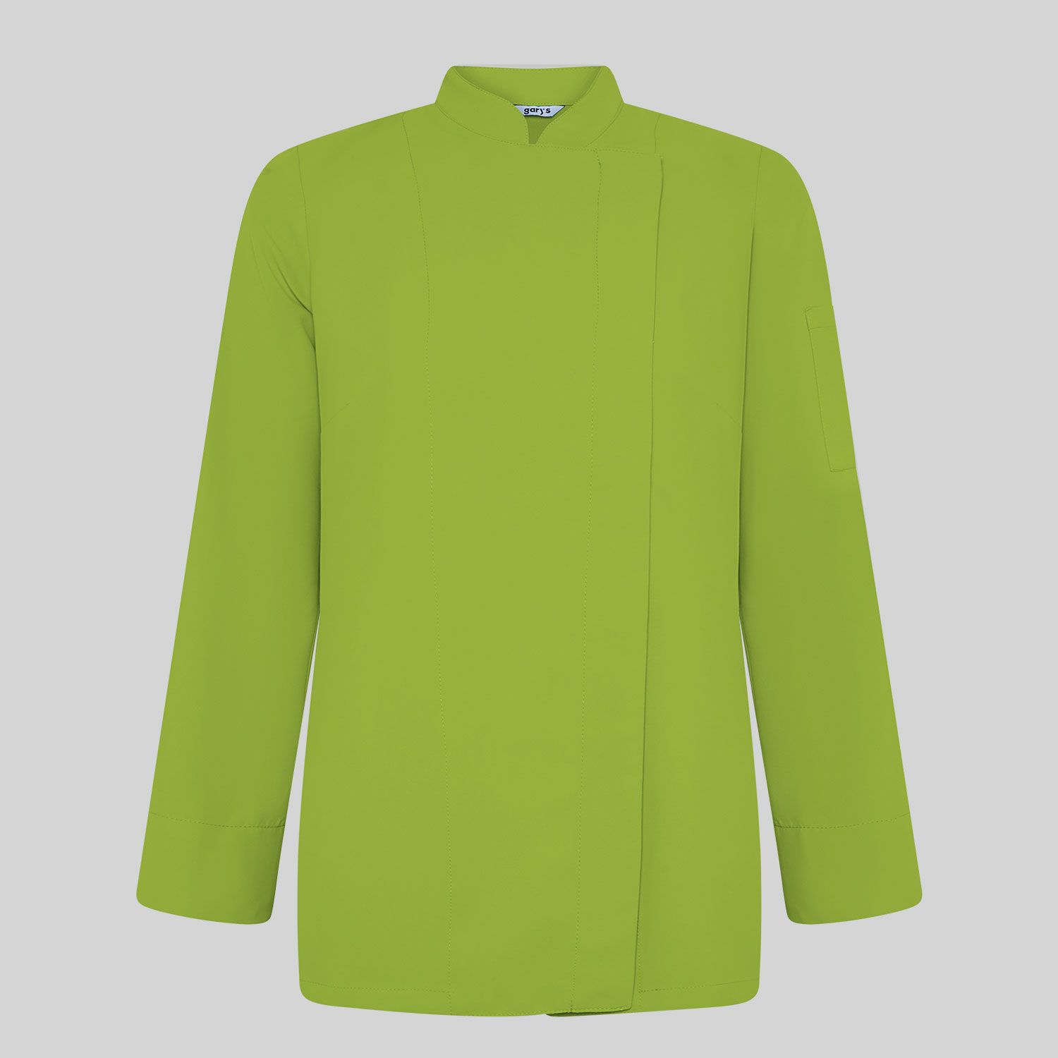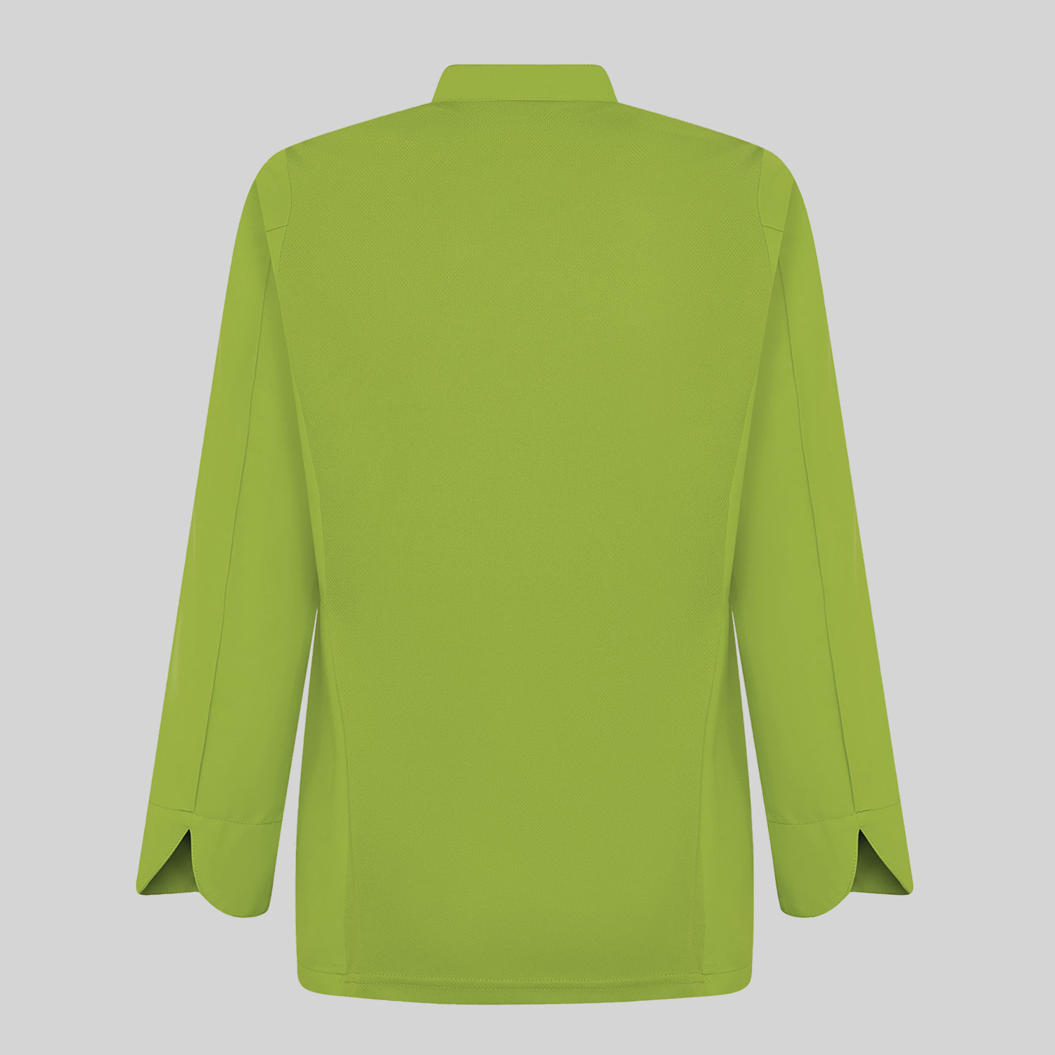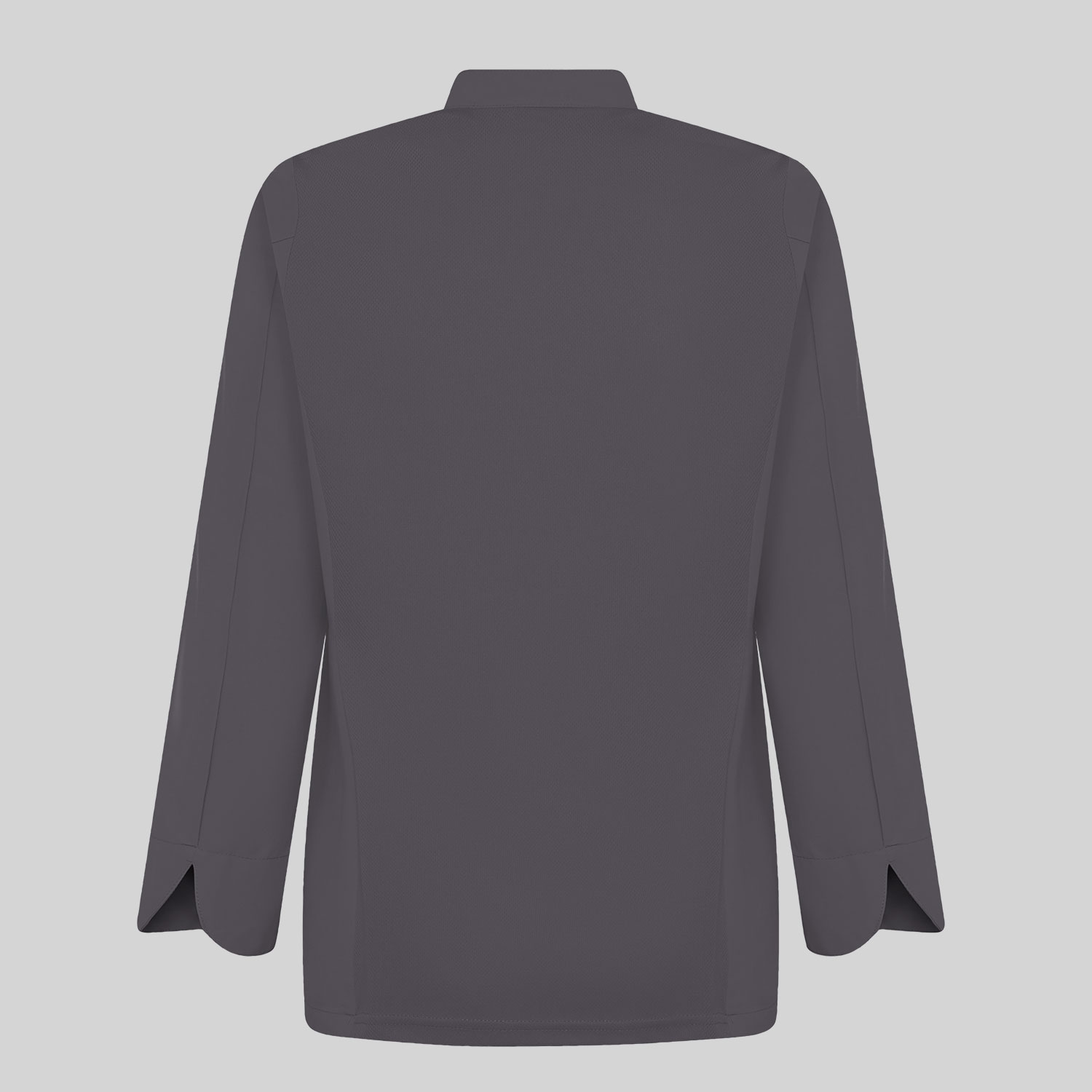 Chaqueta de cocina unisex MIRANDA en microfibra 100% poliéster, transpirable, resistente a lejía, de secado rápido y sin necesidad de plancha. Con manga larga, cuello mao, puños vueltos y cierre cruzado oculto. Incluye bolsillo en la manga y tejido AEROSILVER en la espalda. Disponible en manga corta y modelo para hombre. Ideal para chefs y personal de cocina.