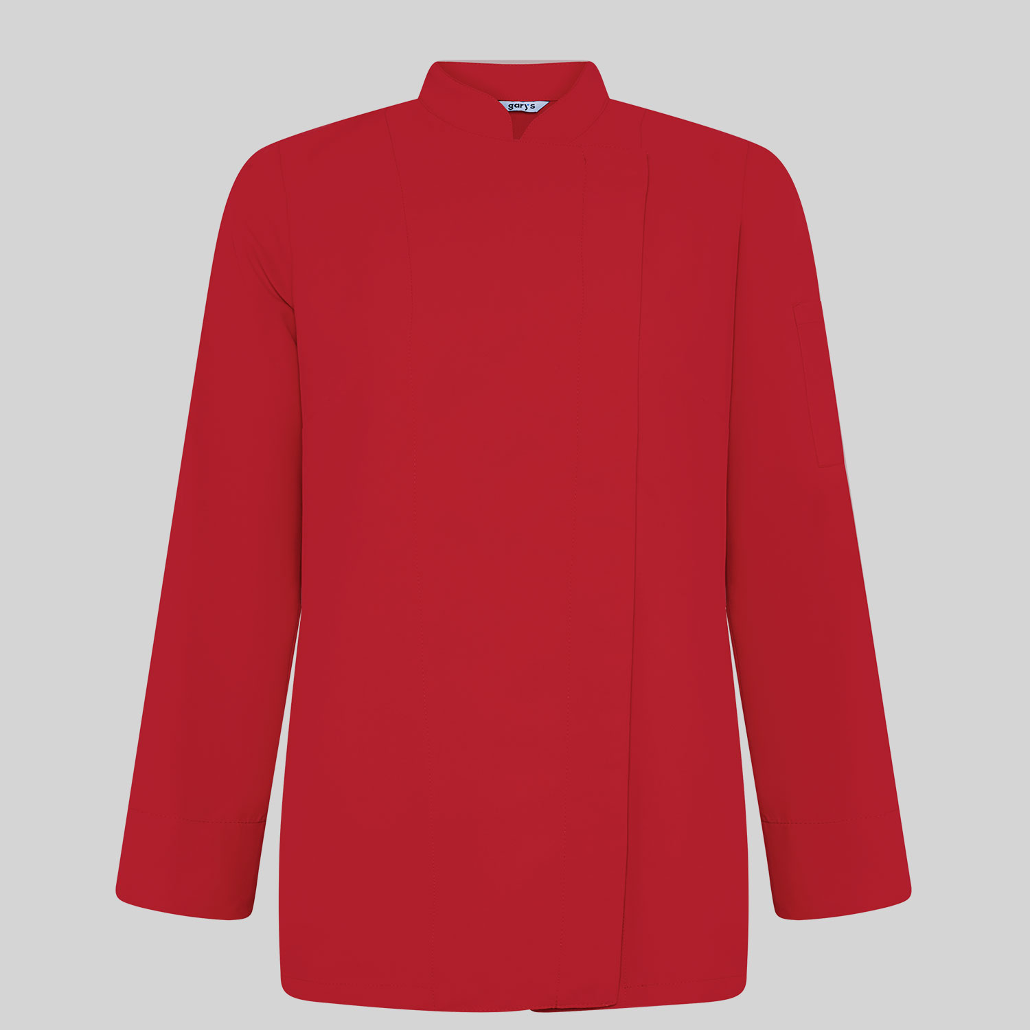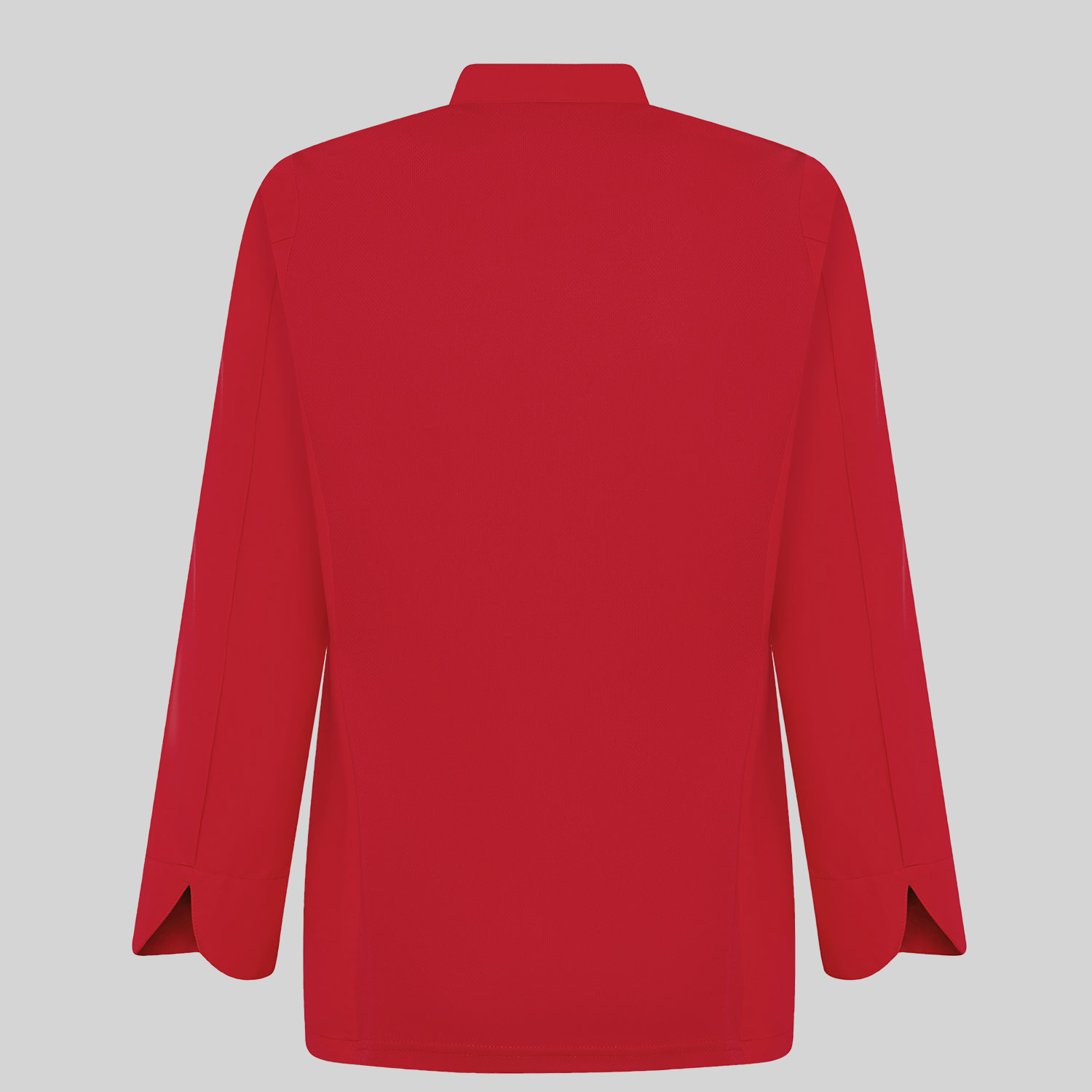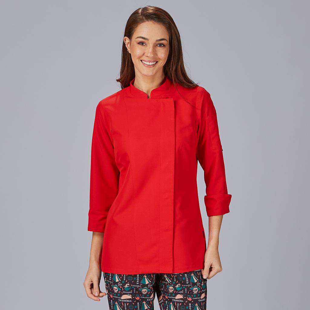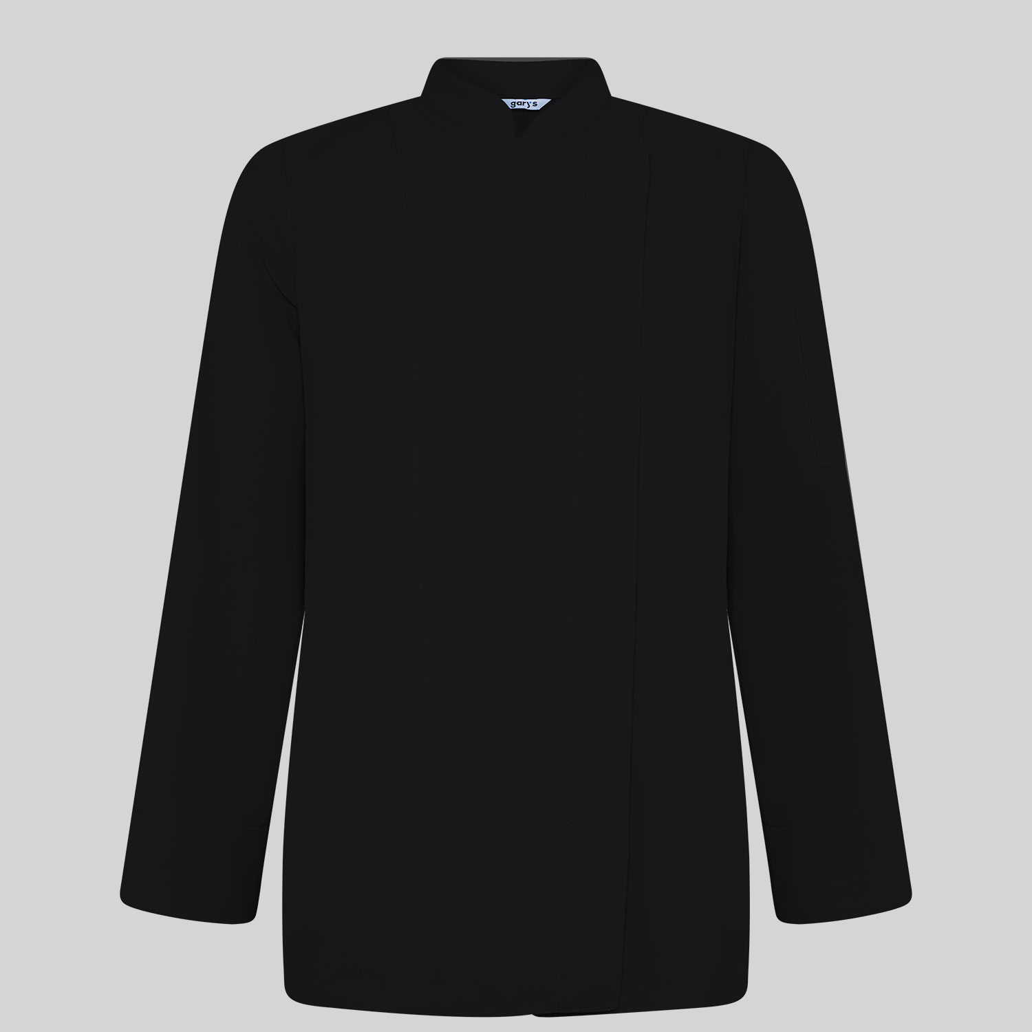 Chaqueta de cocina unisex MIRANDA en microfibra 100% poliéster, transpirable, resistente a lejía, de secado rápido y sin necesidad de plancha. Con manga larga, cuello mao, puños vueltos y cierre cruzado oculto. Incluye bolsillo en la manga y tejido AEROSILVER en la espalda. Disponible en manga corta y modelo para hombre. Ideal para chefs y personal de cocina.