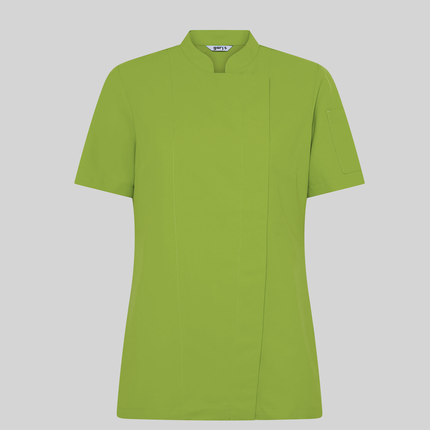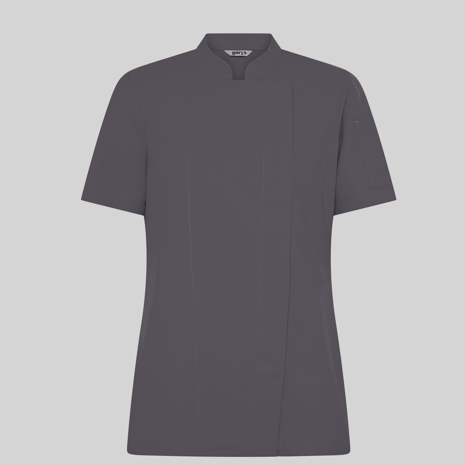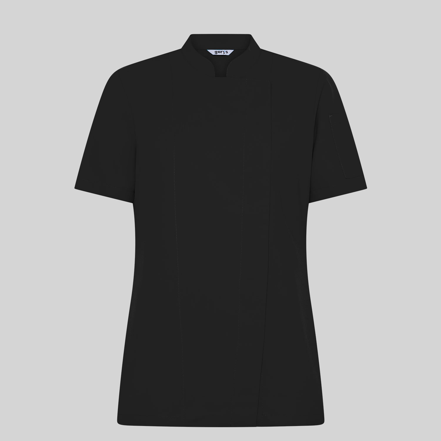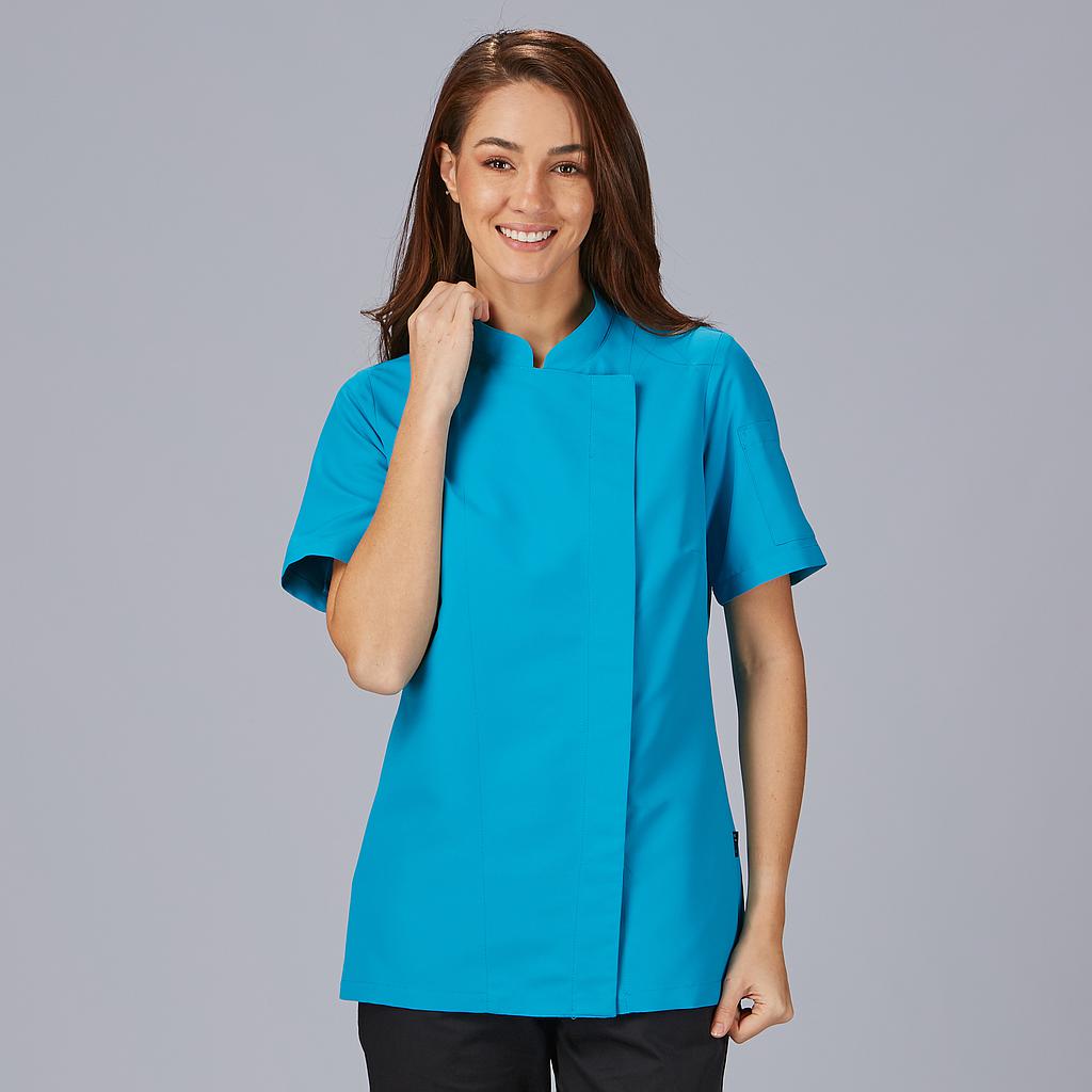 Chaqueta de cocina de mujer PAZ en microfibra 100% poliéster, transpirable, resistente a lejía, de secado rápido y sin plancha. Con manga corta, cuello mao, cierre cruzado oculto y bolsillo en la manga. Diseño semi ajustado con AEROSILVER en la espalda. Disponible en manga larga y modelo para hombre. Ideal para chefs y personal de cocina.
