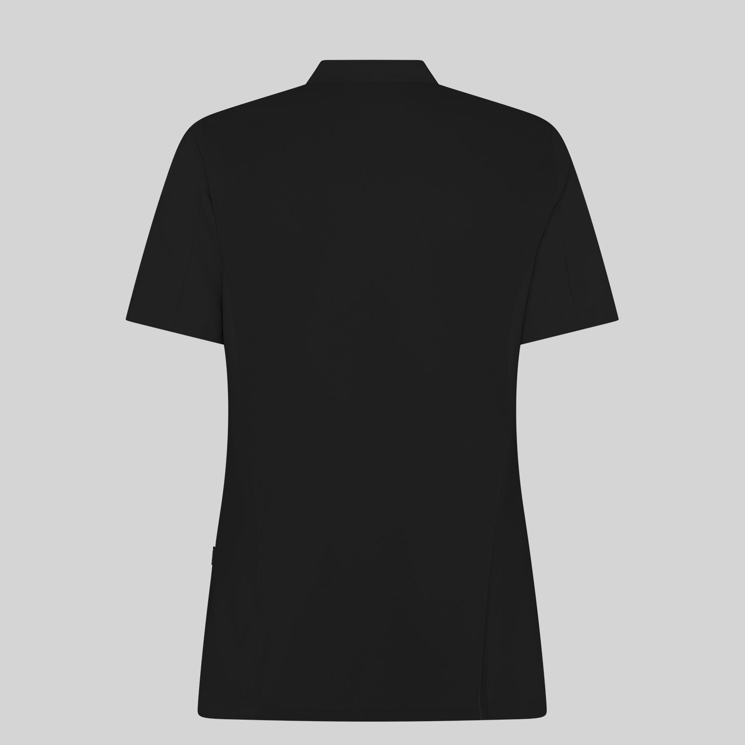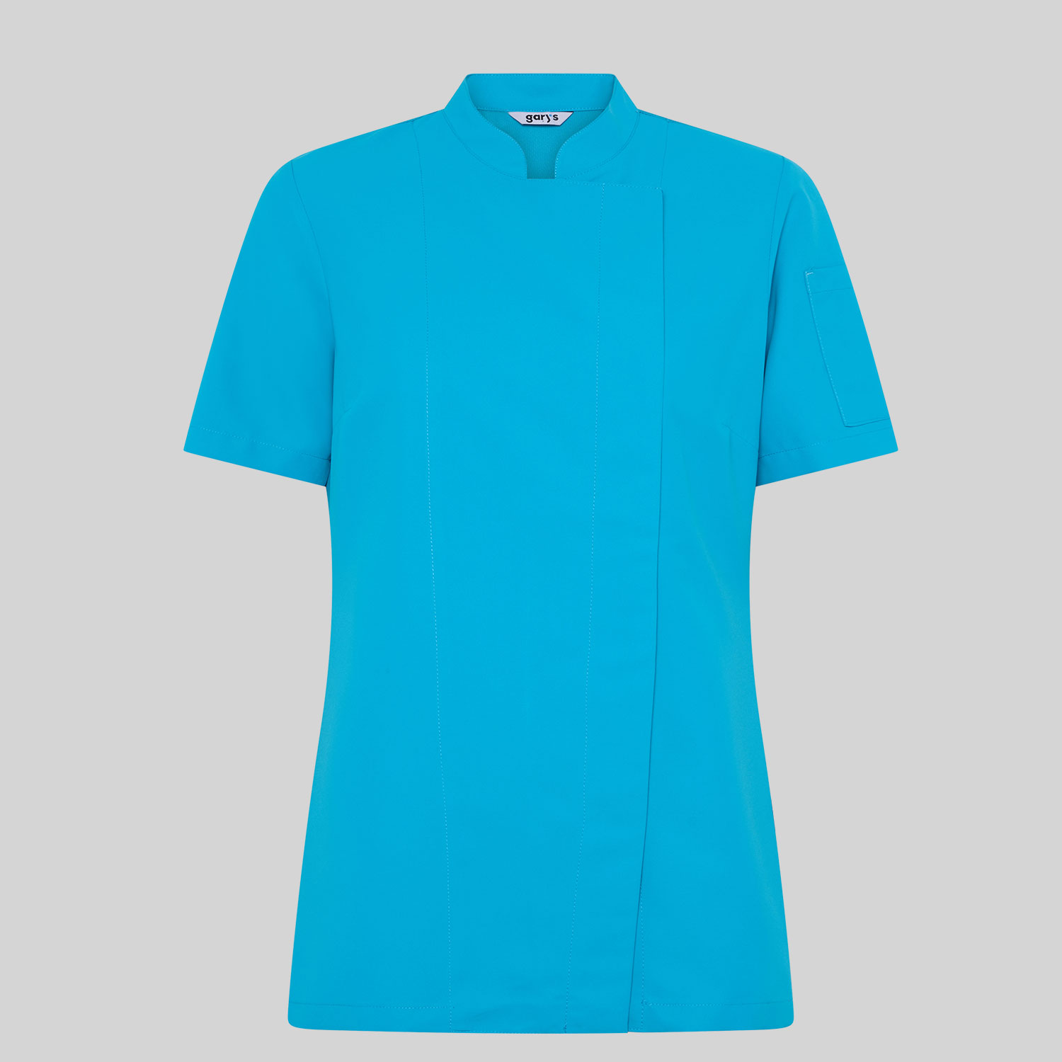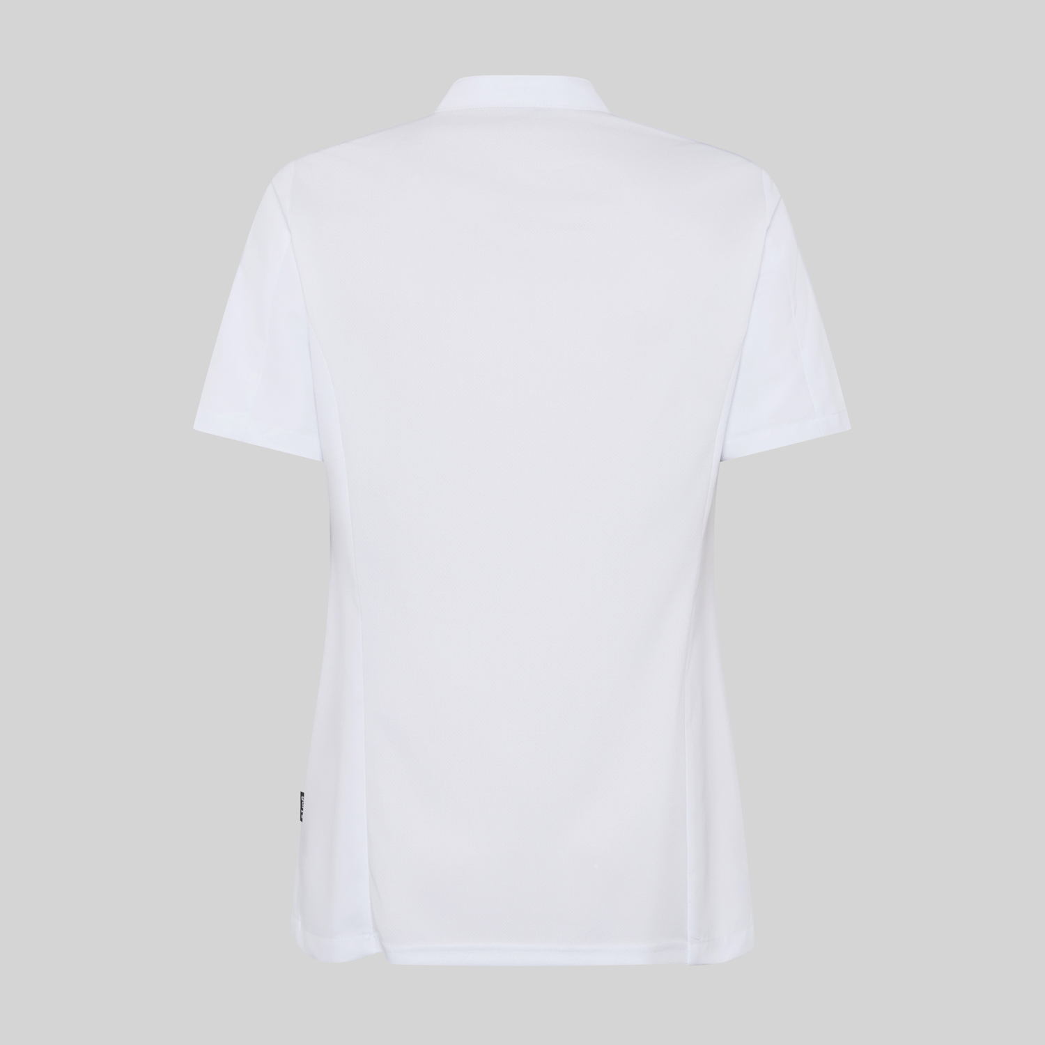 Chaqueta de cocina de mujer PAZ en microfibra 100% poliéster, transpirable, resistente a lejía, de secado rápido y sin plancha. Con manga corta, cuello mao, cierre cruzado oculto y bolsillo en la manga. Diseño semi ajustado con AEROSILVER en la espalda. Disponible en manga larga y modelo para hombre. Ideal para chefs y personal de cocina.
