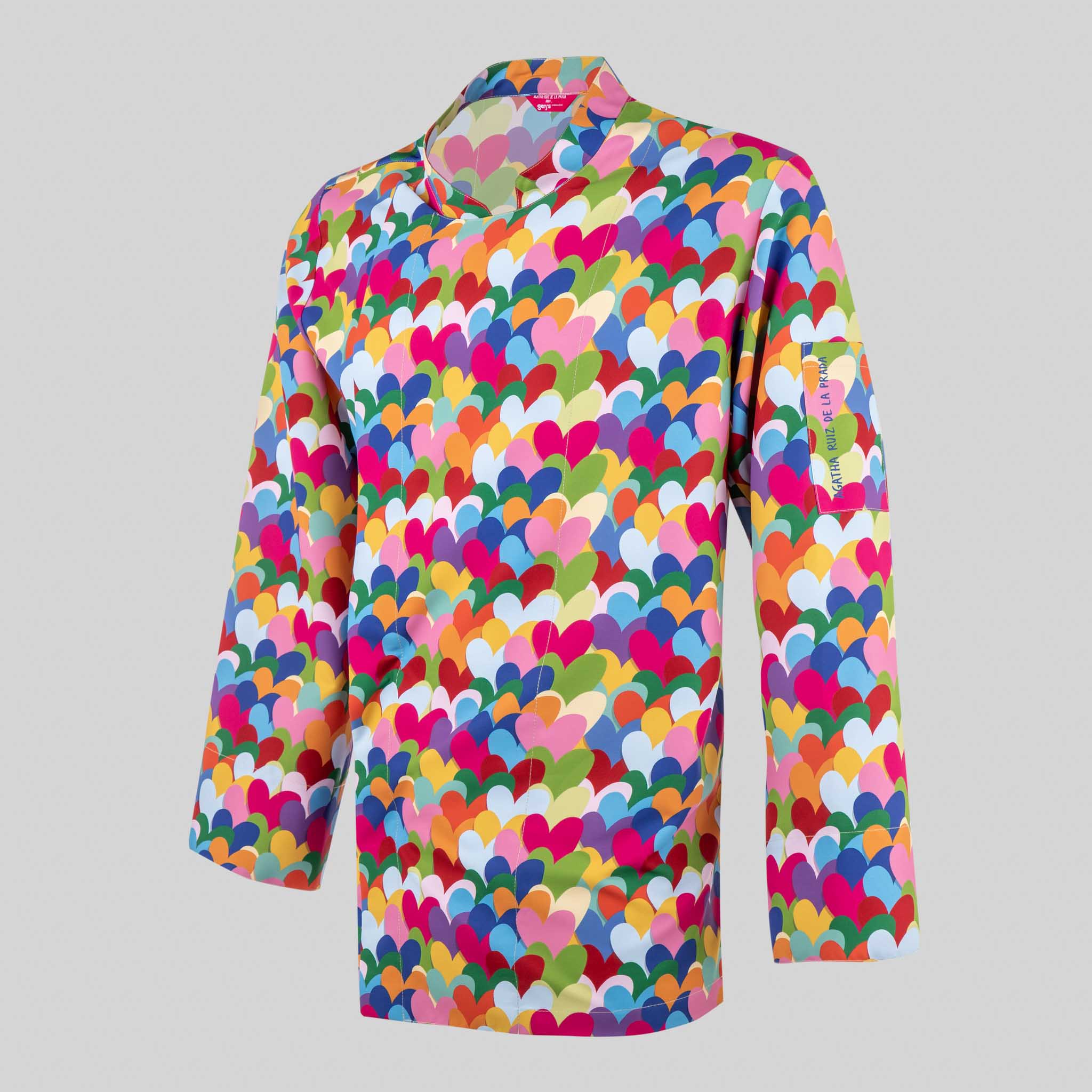 Chaqueta de cocina unisex Heart Algodón Agatha con estampado de corazones multicolor. Confeccionada en sarga 100% algodón orgánico, con cuello mao, puños vueltos y bolsillo en la manga. Ideal para profesionales de hostelería, combina con el pantalón 700054 y gorros Agatha.