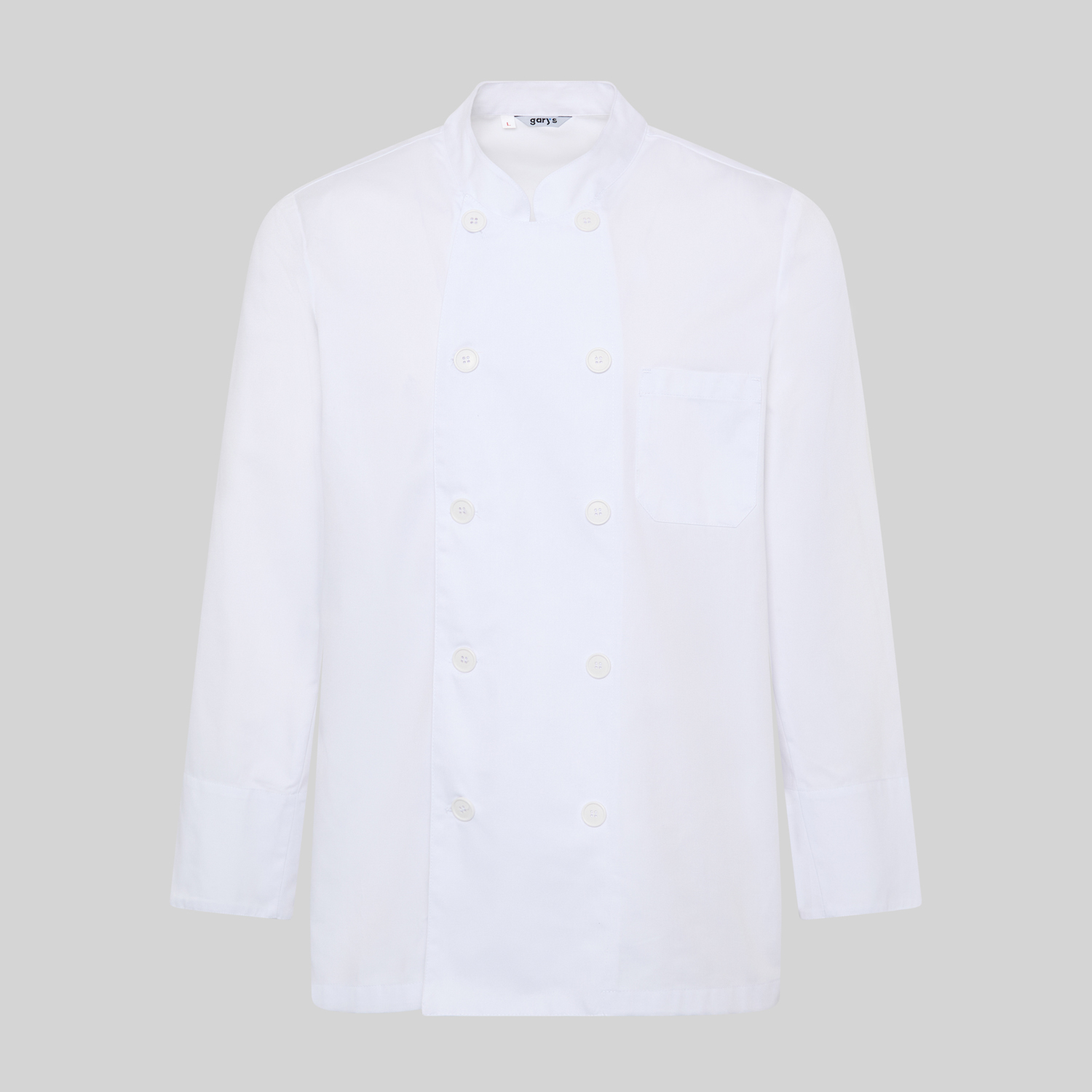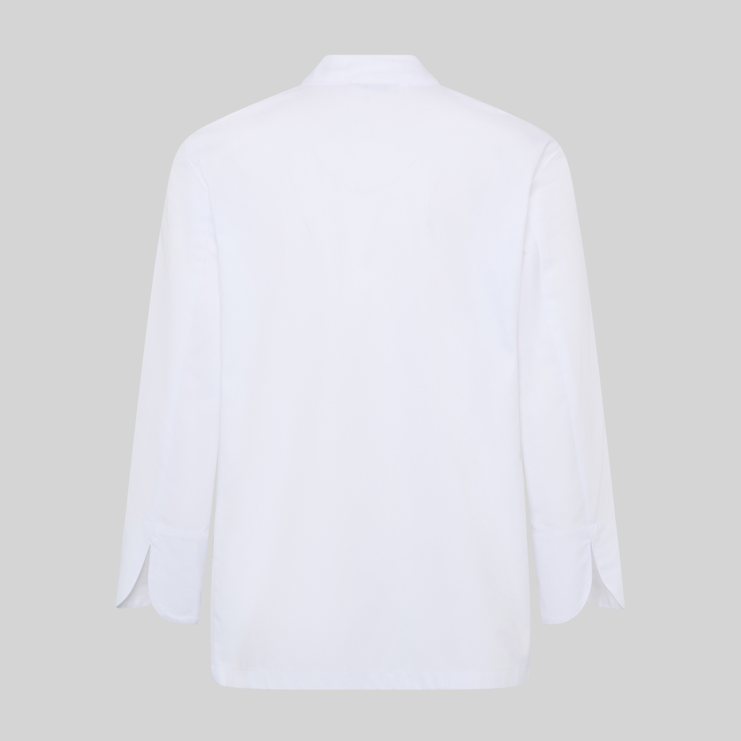 Chaqueta de cocina unisex en sarga blanca, con corte semi ajustado, manga larga con puños vueltos y cuello mao. Incluye cierre cruzado con botones de pastilla vistos y bolsillo en el pecho. Resistente, cómoda y elegante: un básico imprescindible para chefs y cocineros.