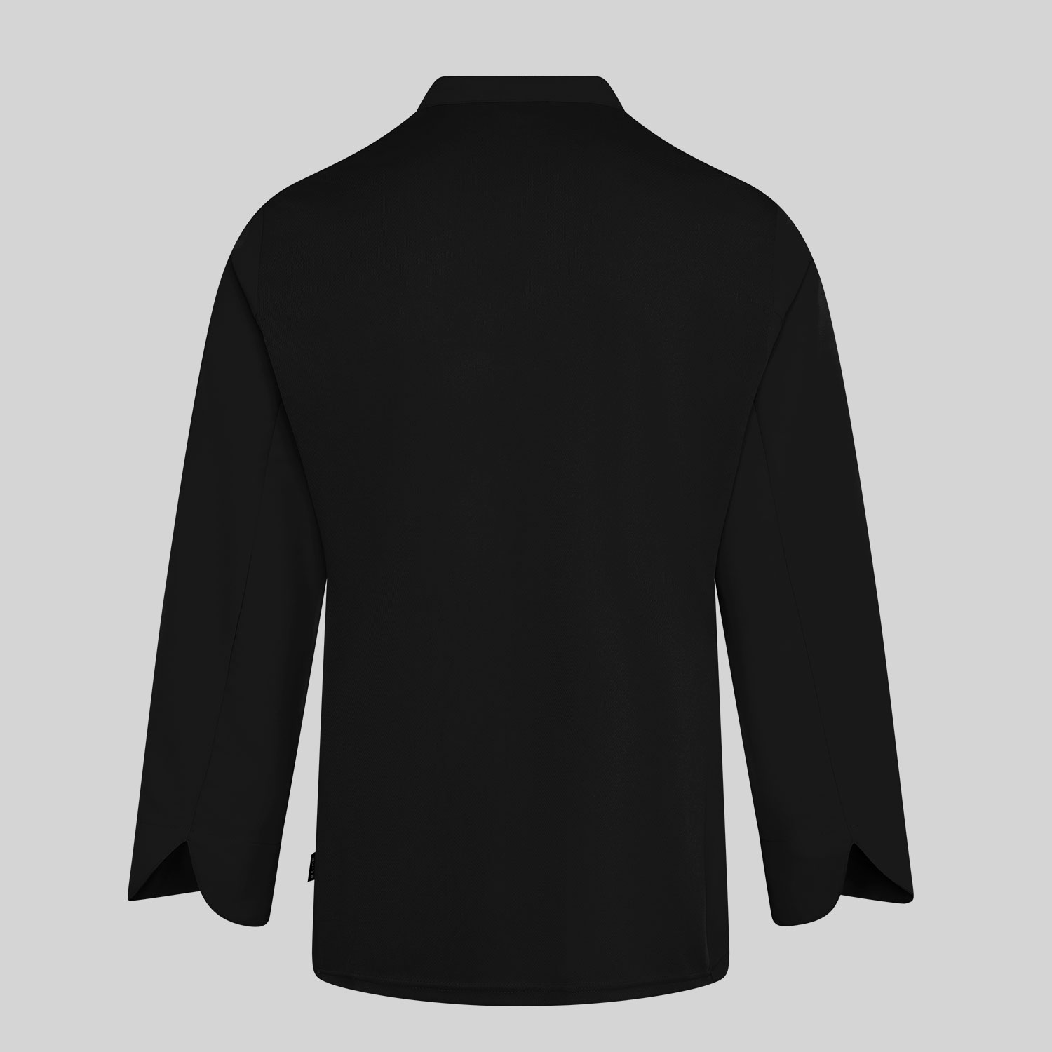 Chaqueta de cocina unisex en sarga (65% poliéster – 35% algodón) con cierre de botones ocultos, cuello Mao y manga con costura de codo. Incluye espalda con tejido AEROSILVER para mayor ventilación y comodidad. Disponible en blanco y negro. También en versión de manga corta (943300).