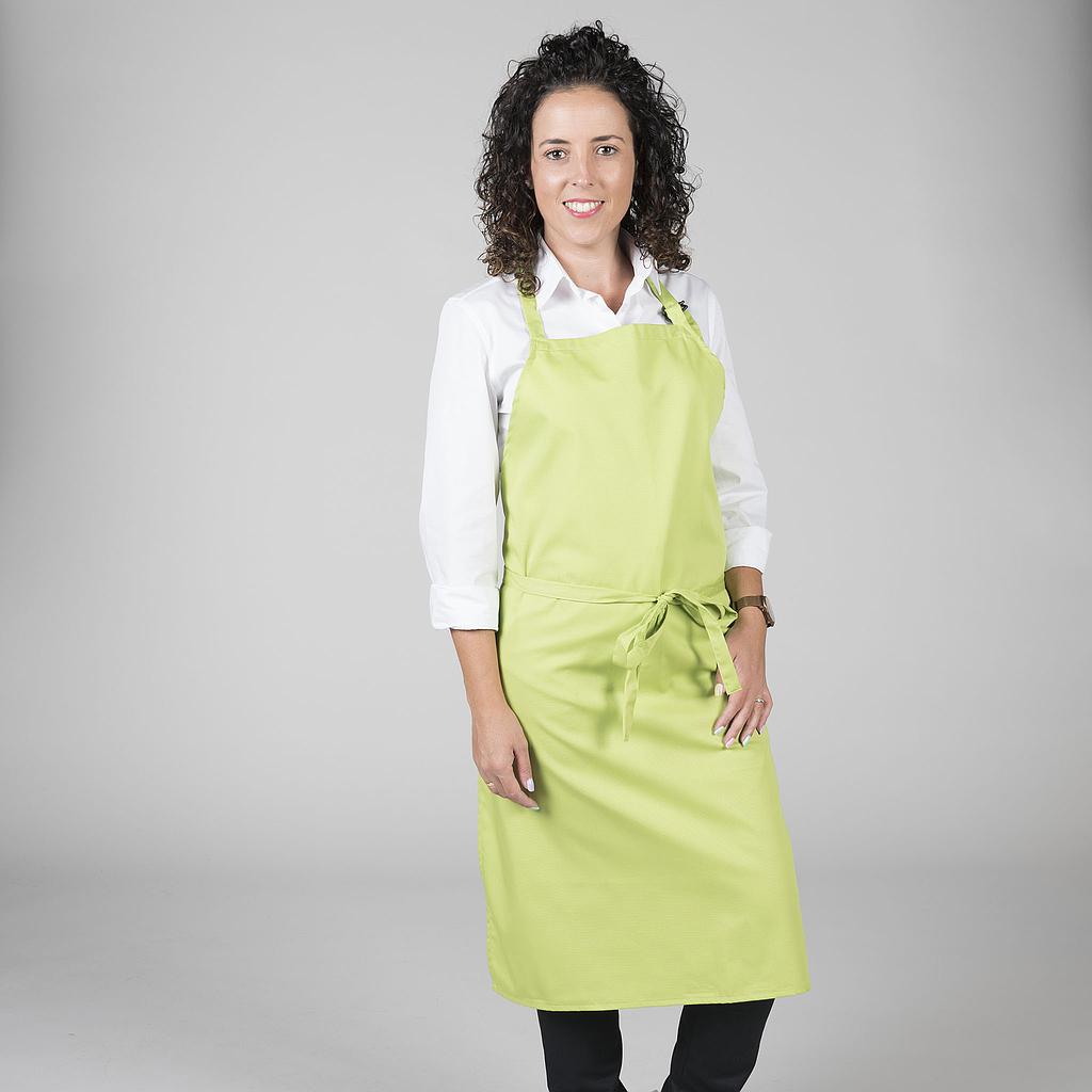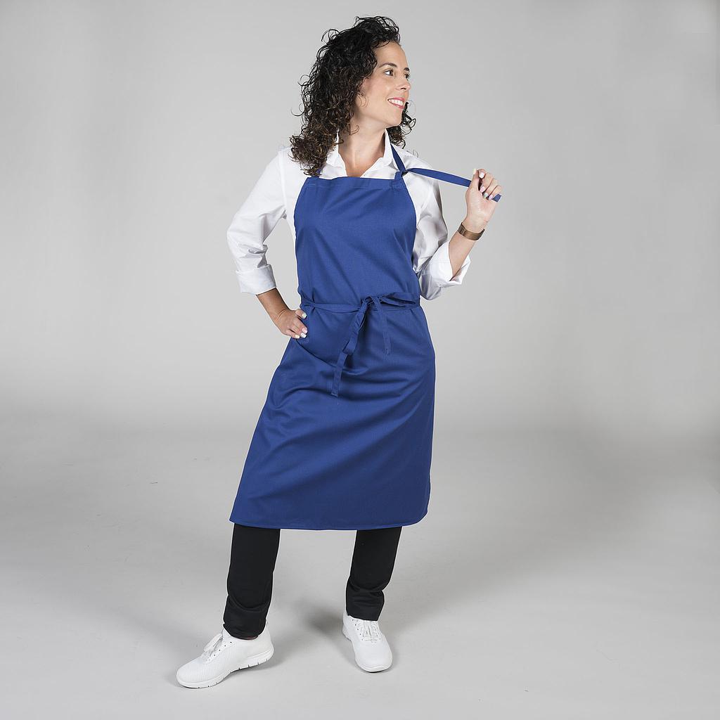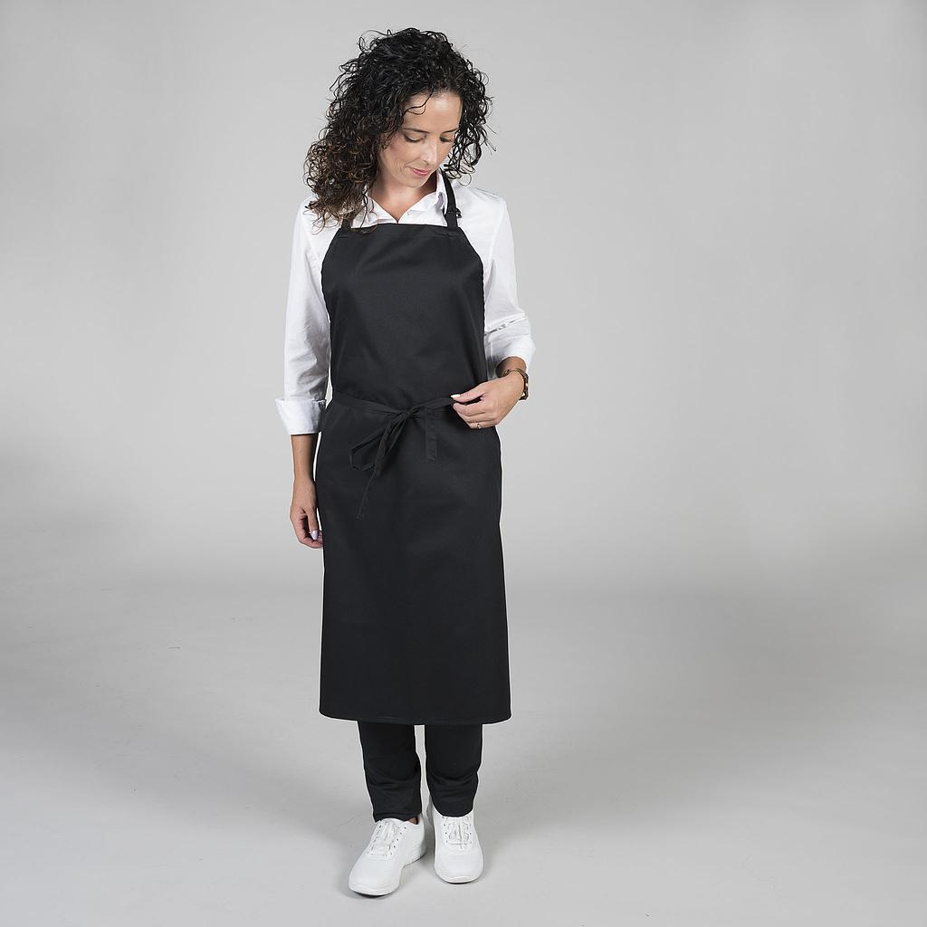 Delantal con peto y hebilla reguladora en el cuello. Sin bolsillos y con cintas del mismo tejido para anudar. Ideal para cocina, restauración, camareros, catering y comercio.