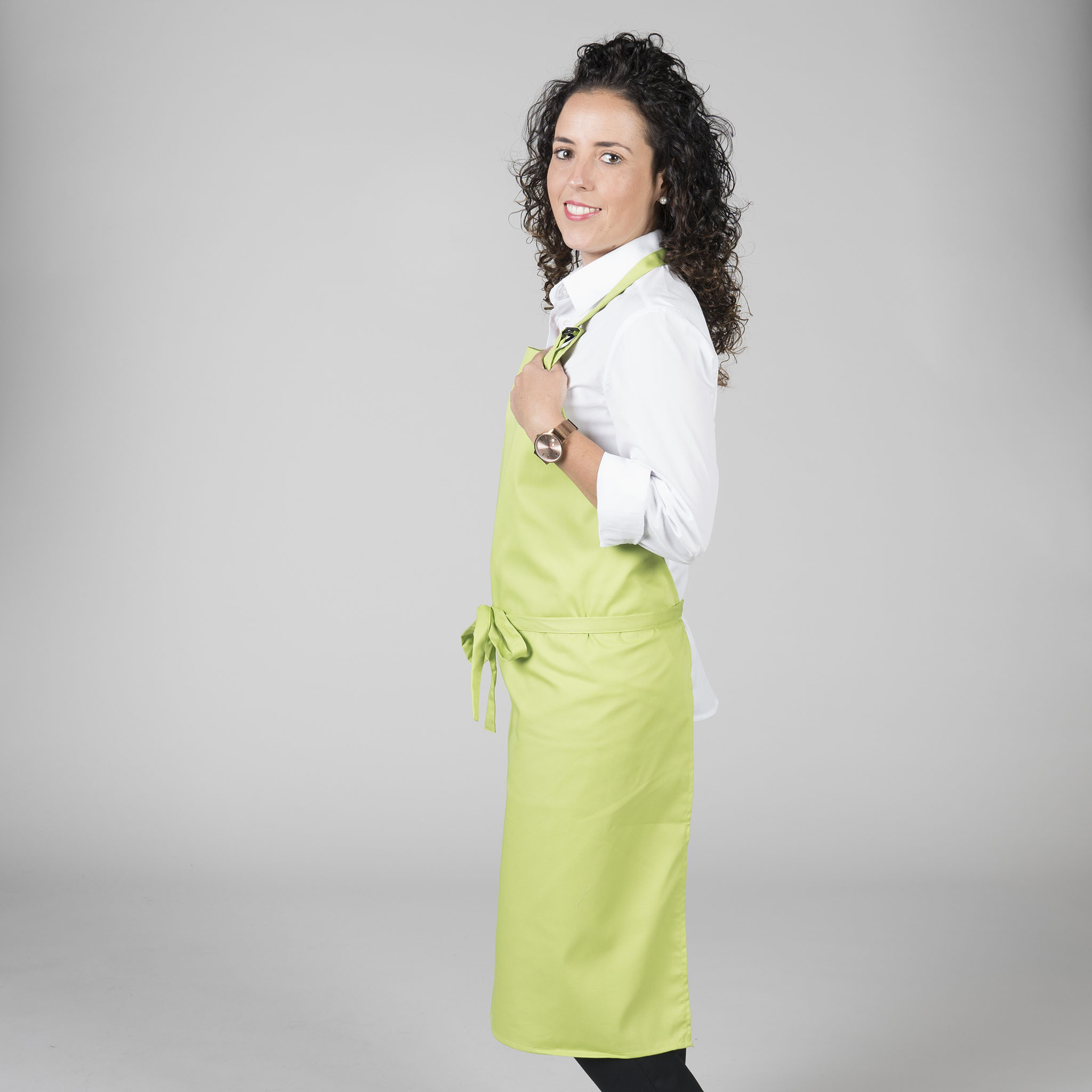 Cuenta con peto superior y una hebilla reguladora en el cuello, que permite ajustar la altura fácilmente para adaptarse a cualquier usuario. Además, incorpora cintas para anudar en la cintura confeccionadas en el mismo tejido, lo que asegura un ajuste firme y homogéneo, manteniendo la estética del delantal.