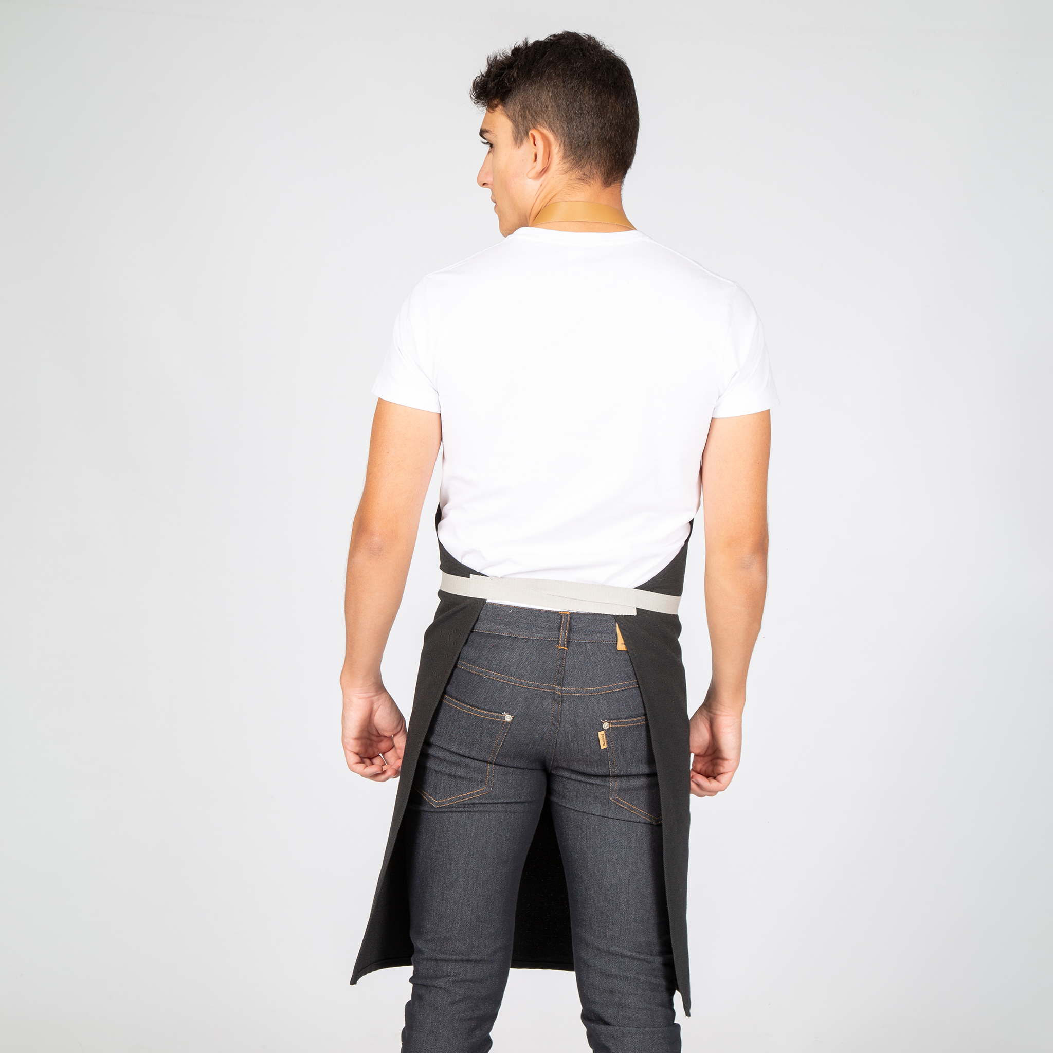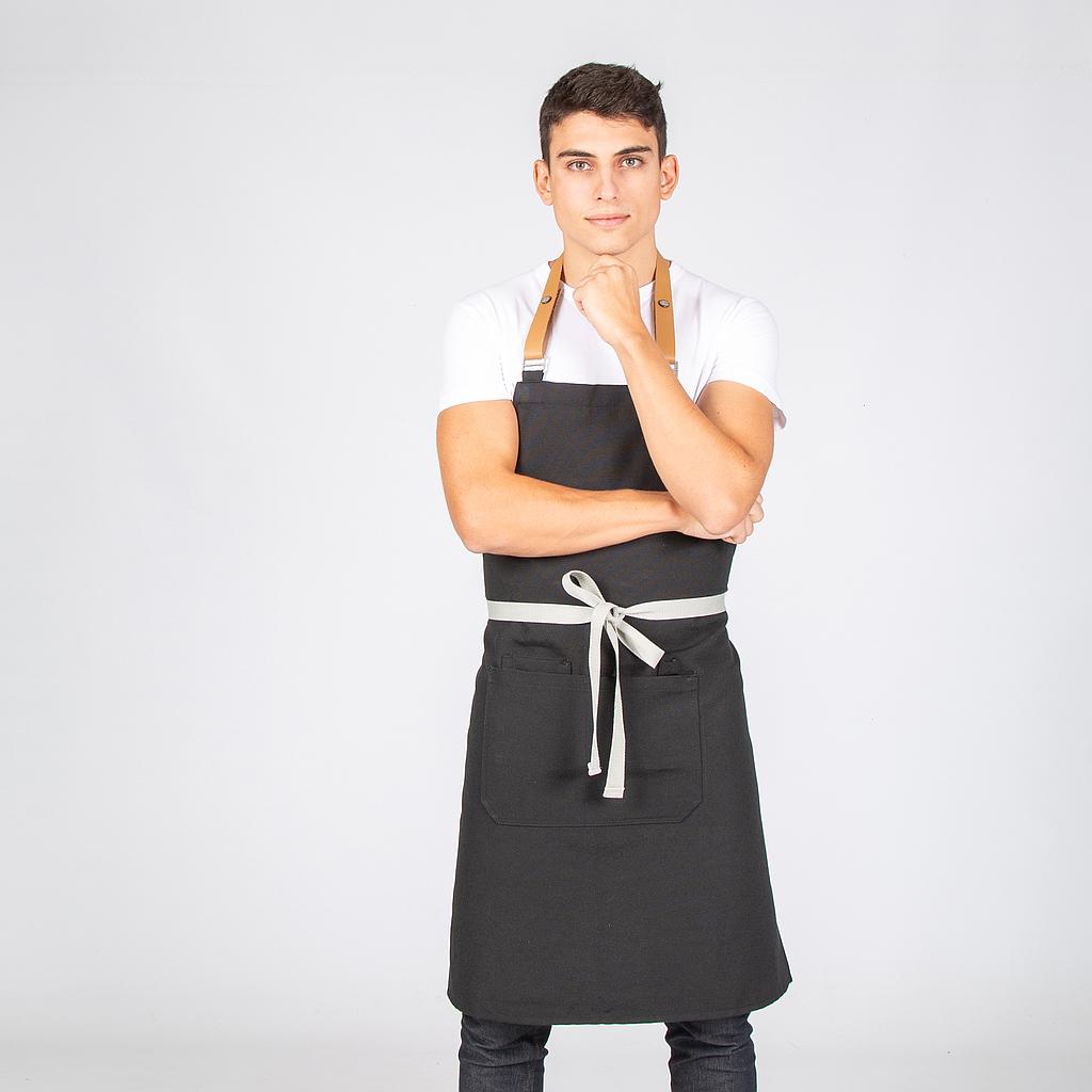 Delantal con peto con tirante de cuello en cuero, ajustable mediante botones de presión. Incluye tres bolsillos frontales, tiras laterales para anudar y tratamiento antimanchas para mayor durabilidad. Disponible en colores negro, turquesa, albero y verde caqui. Ideal para camareros y profesionales de la hostelería y el comercio.