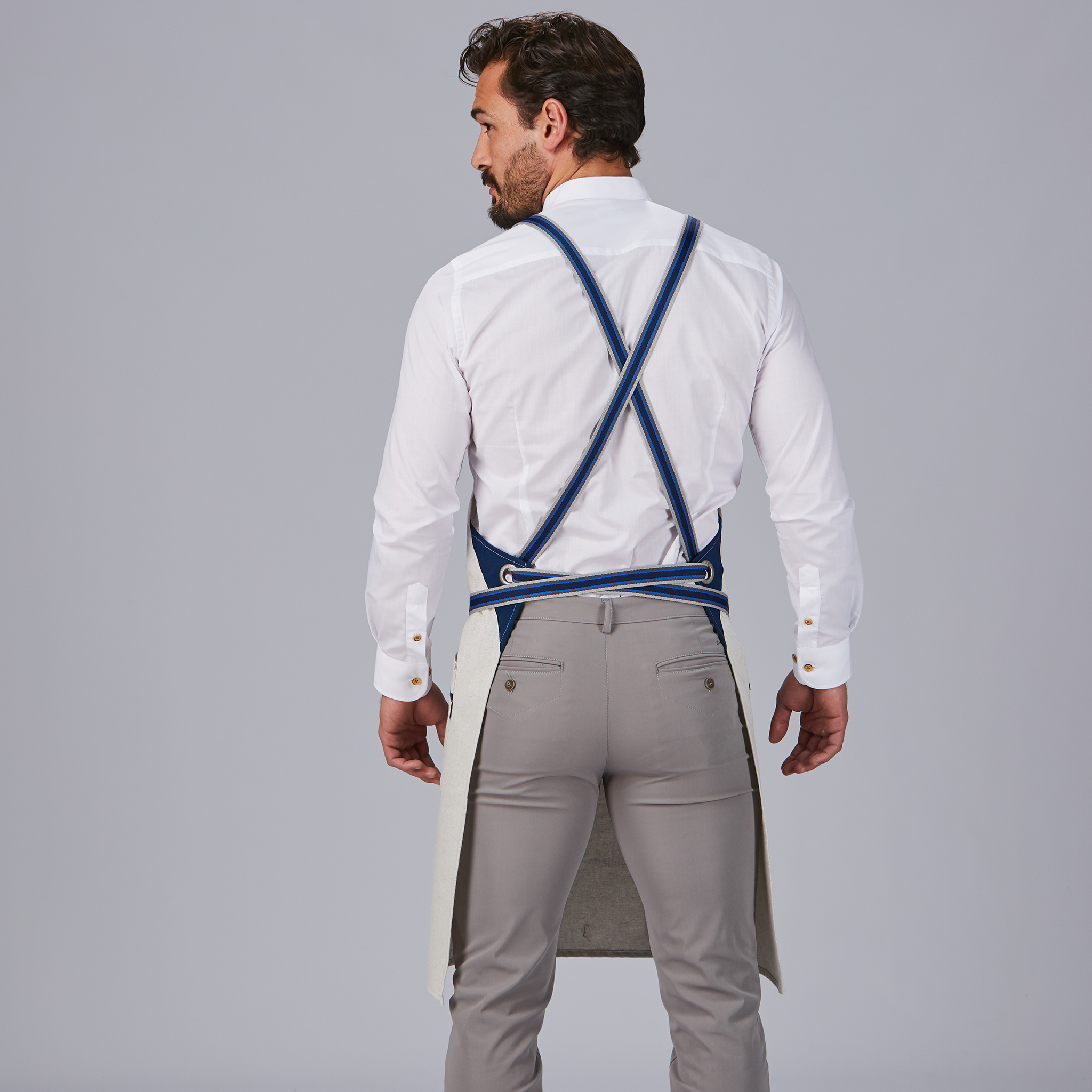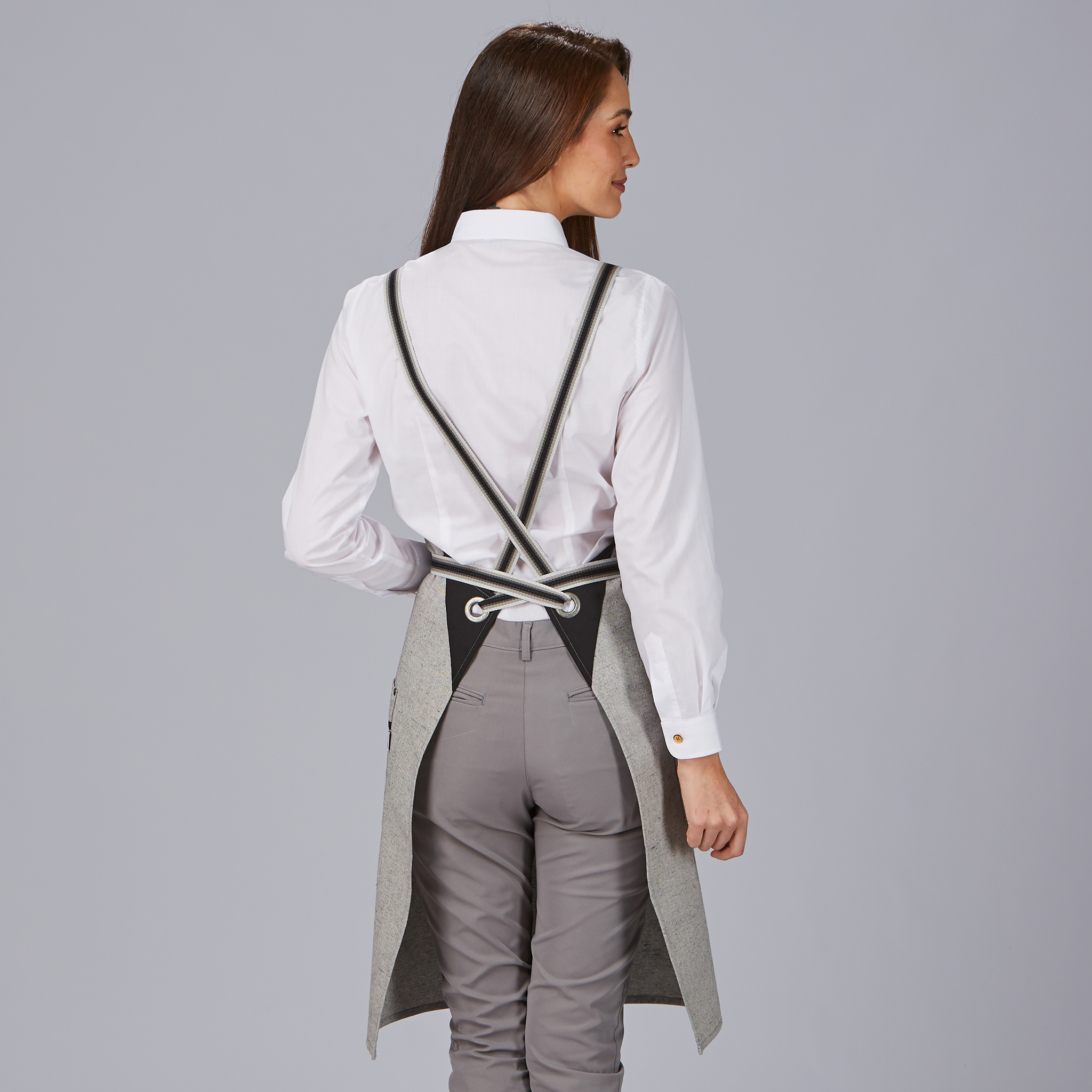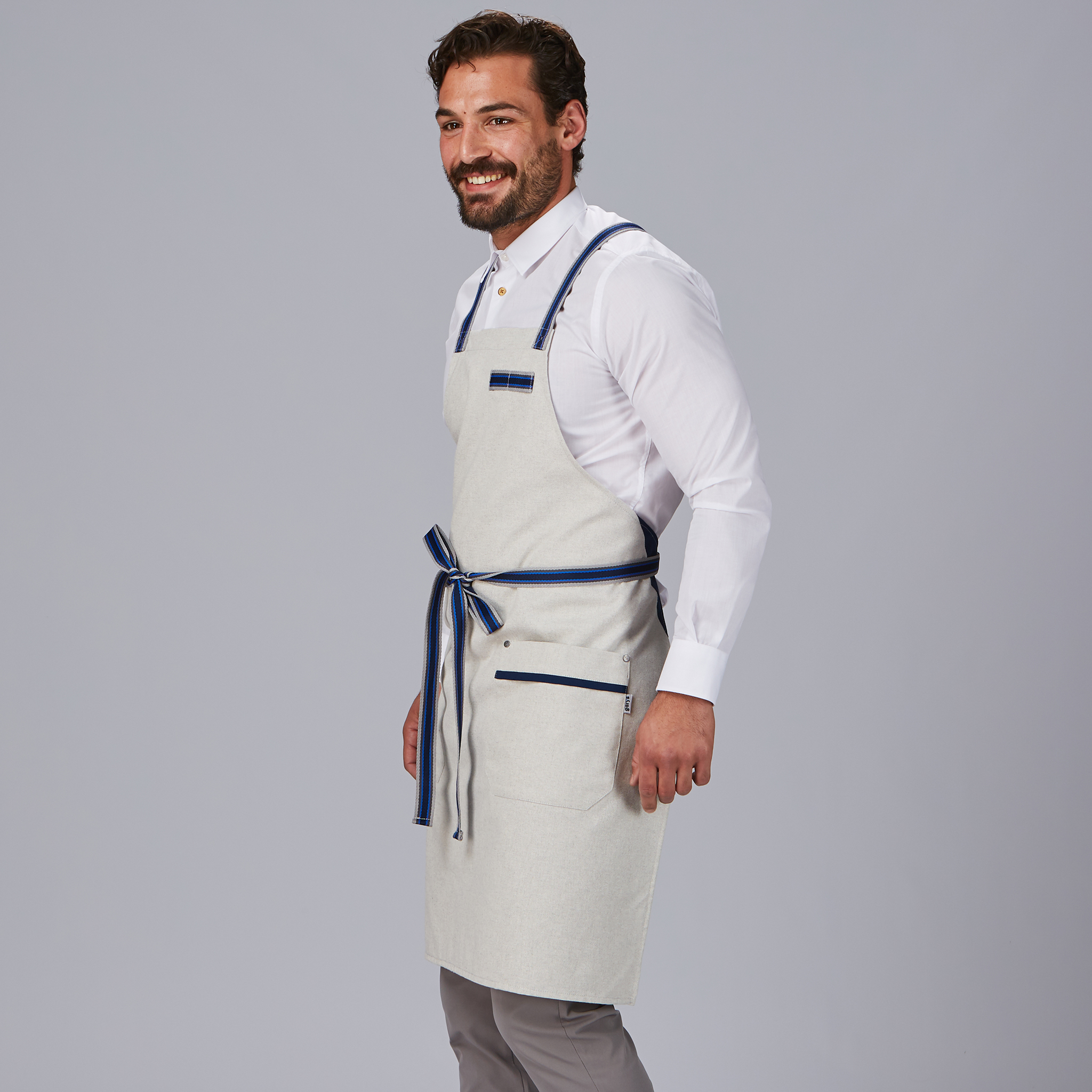 Pensado para facilitar el trabajo diario, incorpora cintas de espiga para el ajuste, permitiendo una sujeción cómoda y segura para cualquier usuario. Además, cuenta con dos bolsillos de cadera, perfectos para llevar utensilios, libreta, paños o accesorios necesarios durante el servicio. En el pecho izquierdo, añade una tira de cinta de espiga, que funciona como detalle estético y útil para colgar herramientas ligeras.
