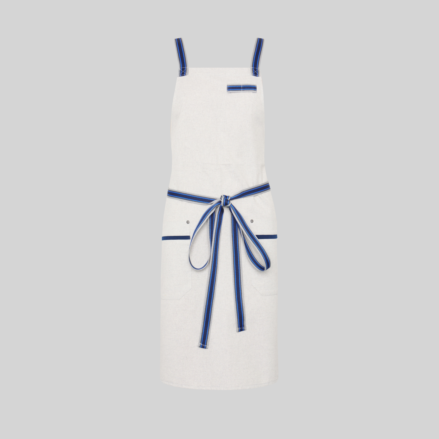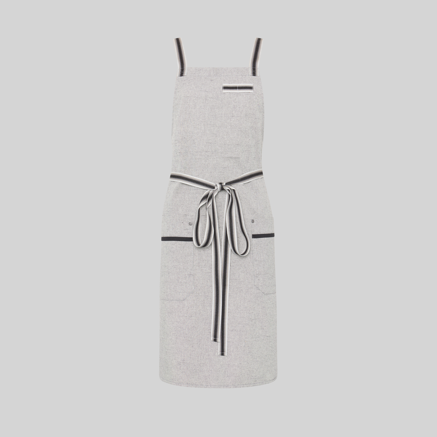Delantal peto en tejido Panamá vigoré (90% algodón – 10% poliéster), con ajuste mediante cintas de espiga, dos bolsillos de cadera y refuerzos acrílicos en las esquinas. Largo 88 cm. Disponible en gris y gris claro. Ideal para hostelería y comercio.