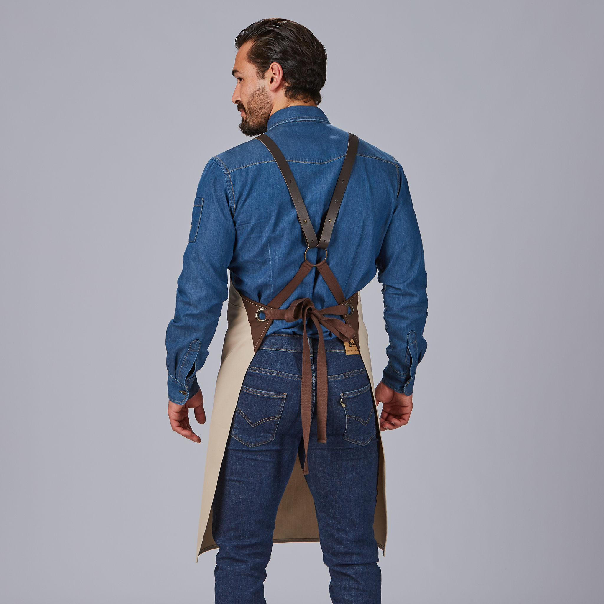 El Delantal Peto con Herrajes en Piel es la elección ideal para profesionales de la hostelería y la restauración que necesitan una prenda resistente, elegante y altamente funcional. Diseñado para ofrecer comodidad durante largas jornadas, incorpora un sistema de ajuste ergonómico con cintas de espiga en la cadera y tiras de piel en el cuello, permitiendo un ajuste personalizado que garantiza libertad de movimiento.