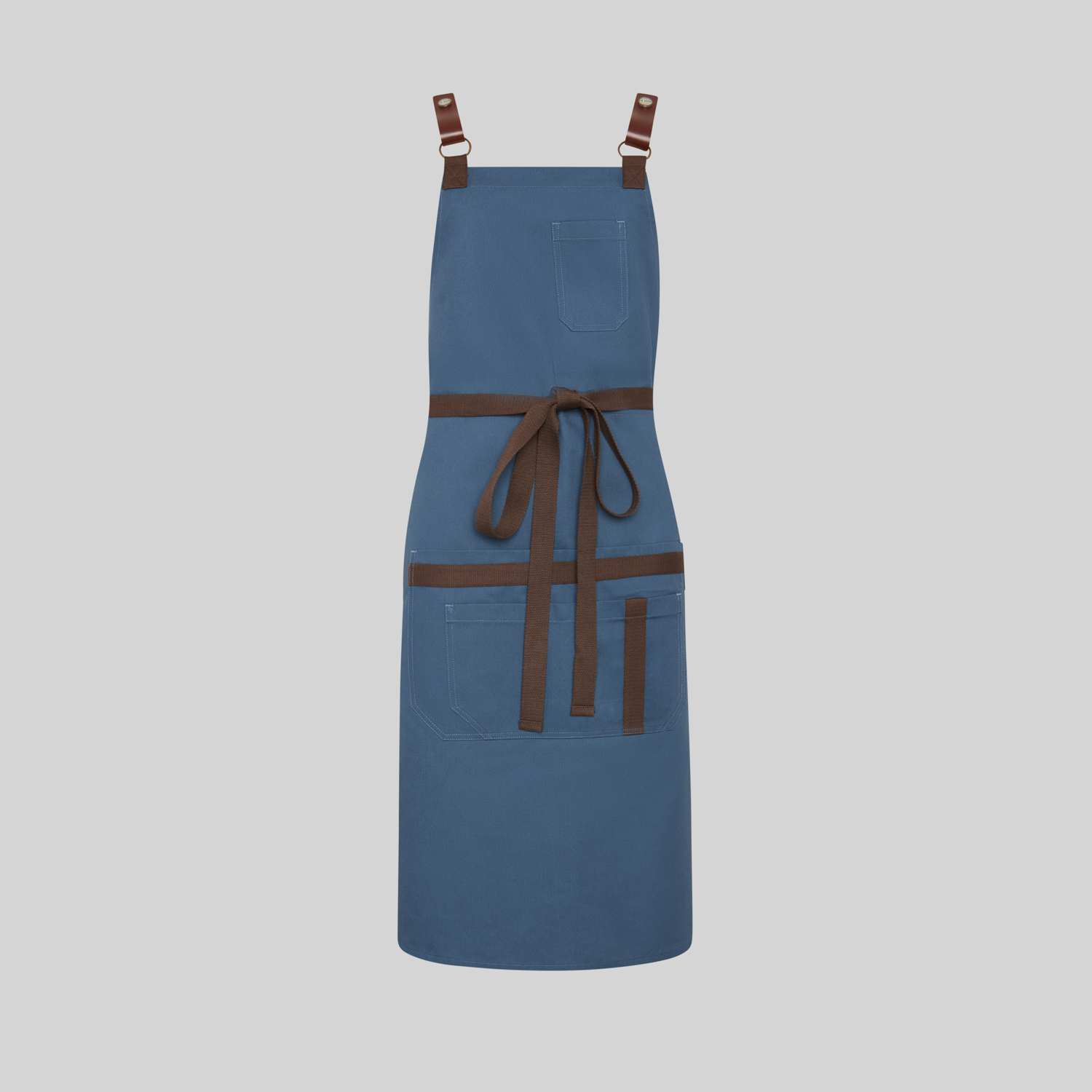 Delantal peto de sarga resistente con tiras de piel y cintas de espiga ajustables. Incluye tres bolsillos funcionales, laterales reforzados y 88 cm de largo. Disponible en negro, beige y azul petróleo. Ideal para hostelería.