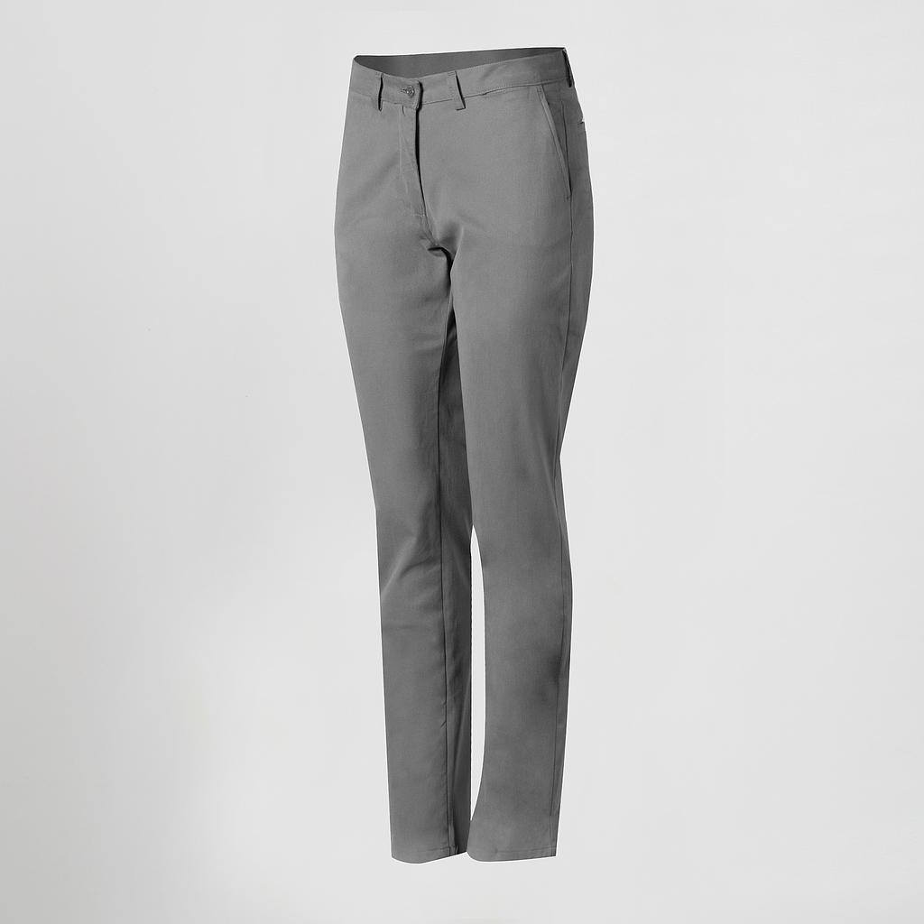 Pantalón de mujer CHINO, slim fit, confeccionado en sarga esmerilada (97% algodón, 3% elastano, 270 g/m²). Con bolsillos tipo francés delanteros y bolsillos de vivo traseros. Suave, resistente y elegante, ideal para uniformes de invierno en hostelería, oficina o comercio.