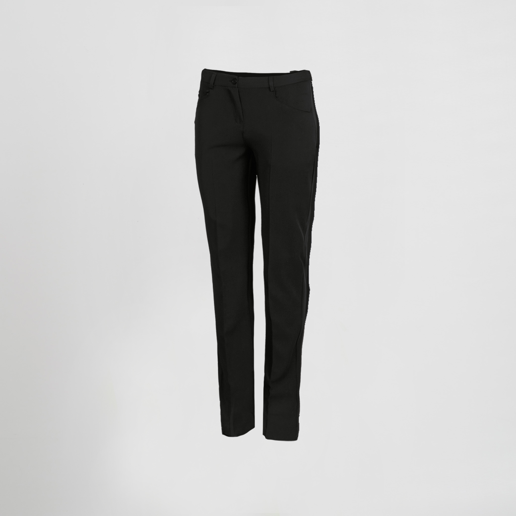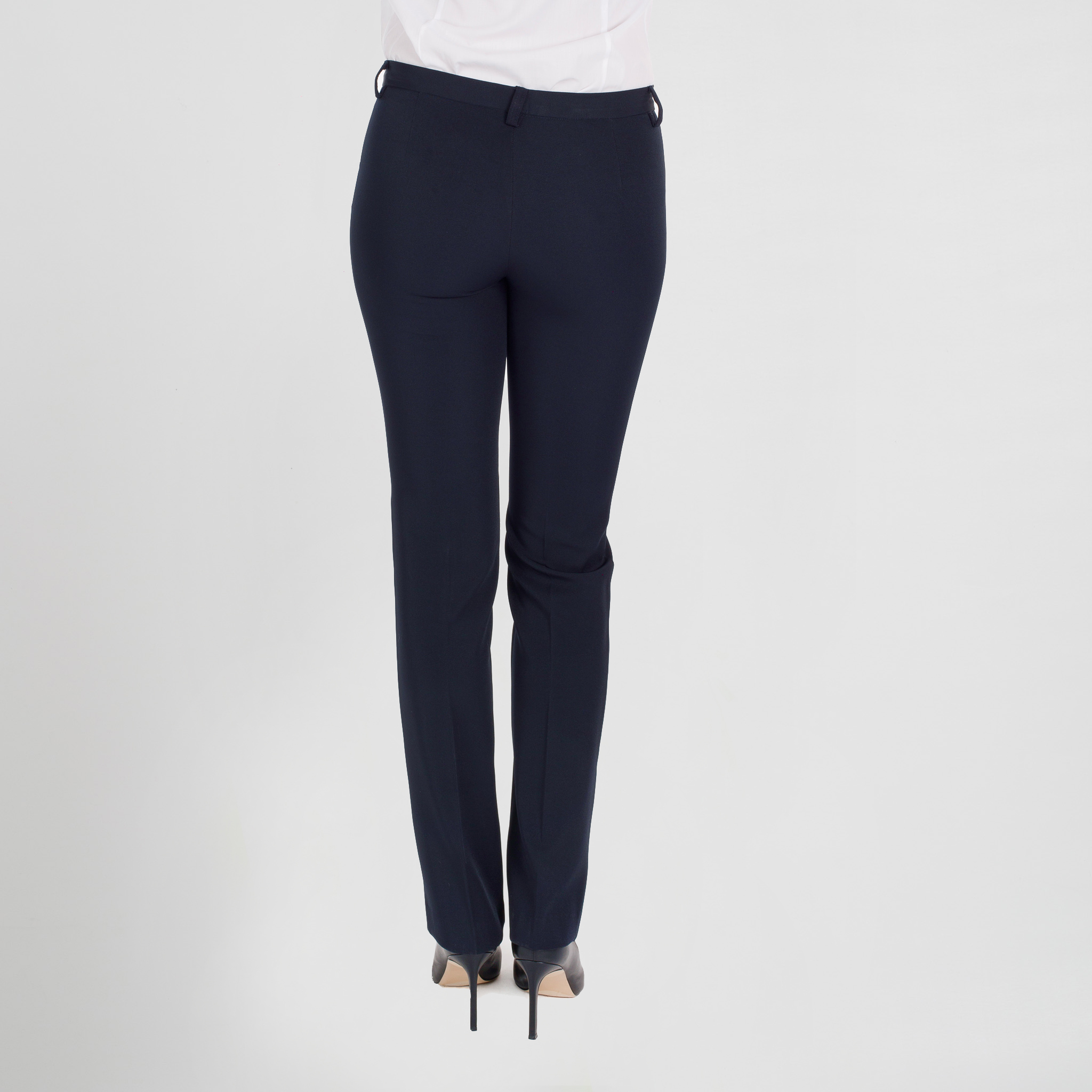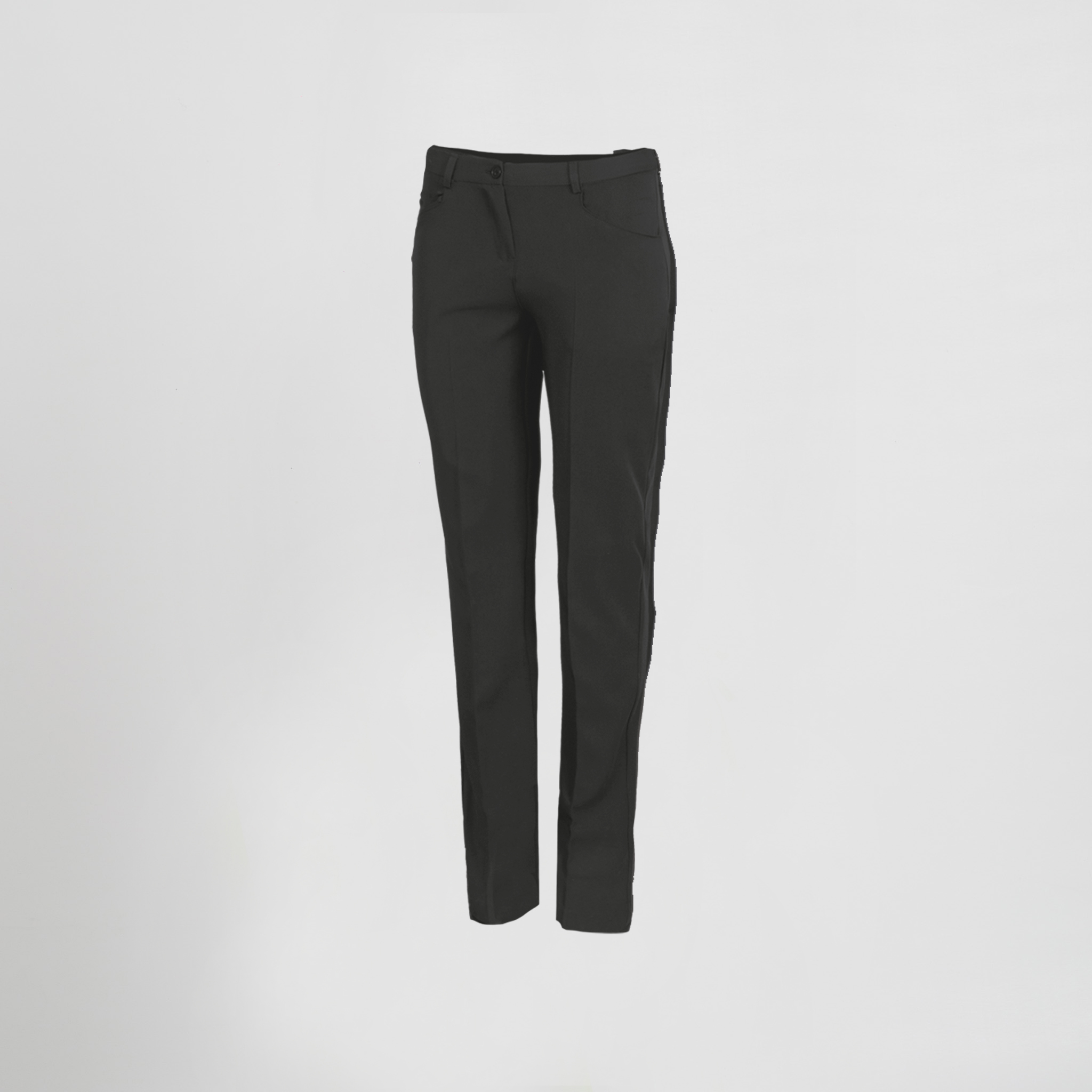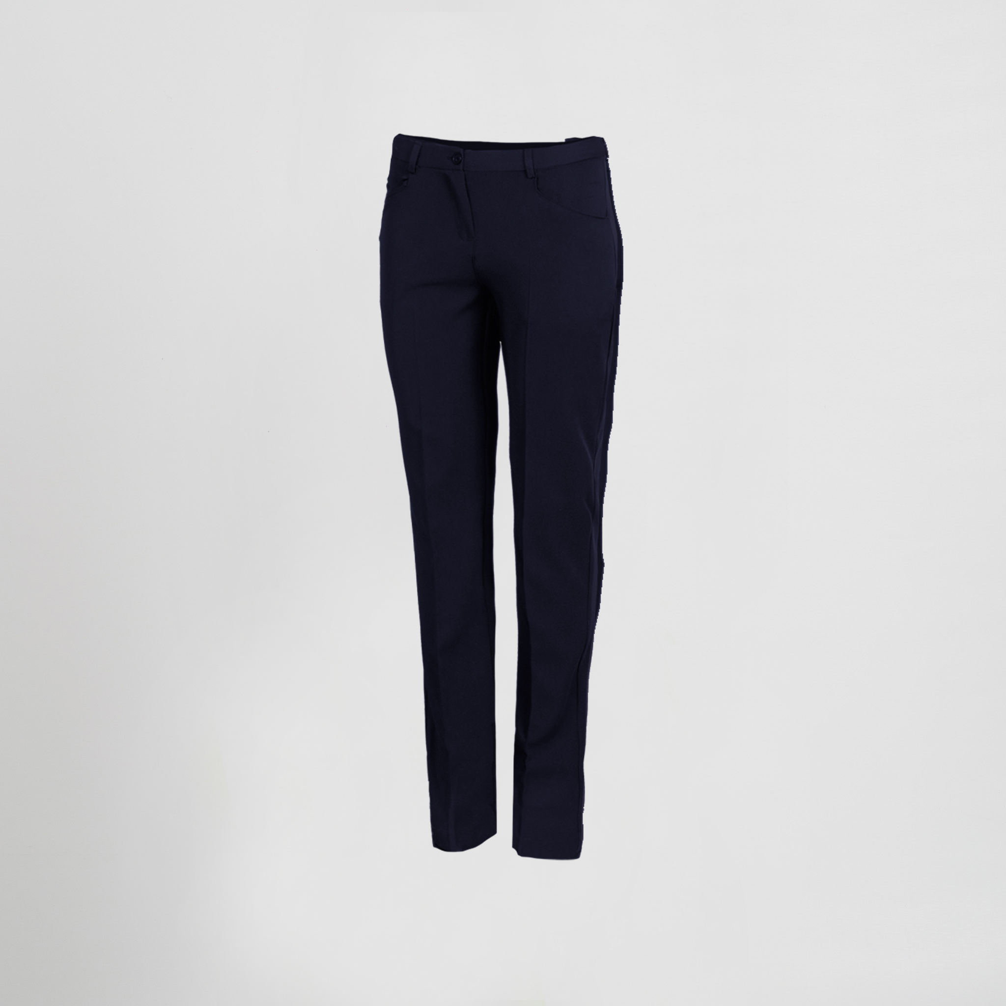 Pantalón de mujer de talle medio en tejido TECNO (96% poliéster, 4% elastano). Con bolsillos laterales, trabillas y cierre de botón y cremallera. Sin pinzas, resistente a las manchas y fácil de planchar. Ideal para uso profesional.